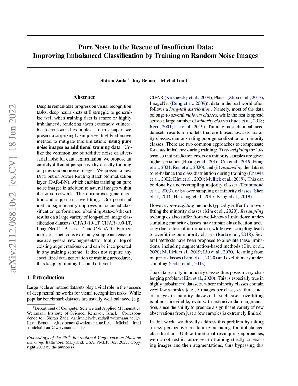 Despite remarkable progress on visual recognition tasks, deep neural-nets still struggle to generalize well when training data is scarce or highly imbalanced, rendering them extremely vulnerable to real-world examples. In this paper, we present a surprisingly simple yet highly effective method to mitigate this limitation: using pure noise images as additional training data. Unlike the common use of additive noise or adversarial noise for data augmentation, we propose an entirely different perspective by directly training on pure random noise images. We present a new Distribution-Aware Routing Batch Normalization layer (DAR-BN), which enables training on pure noise images in addition to natural images within the same network. This encourages generalization and suppresses overfitting. Our proposed method significantly improves imbalanced classification performance, obtaining state-of-the-art results on a large variety of long-tailed image classification datasets (CIFAR-10-LT, CIFAR-100-LT, ImageNet-LT, Places-LT, and CelebA-5). Furthermore, our method is extremely simple and easy to use as a general new augmentation tool (on top of existing augmentations), and can be incorporated in any training scheme. It does not require any specialized data generation or training procedures, thus keeping training fast and efficient.