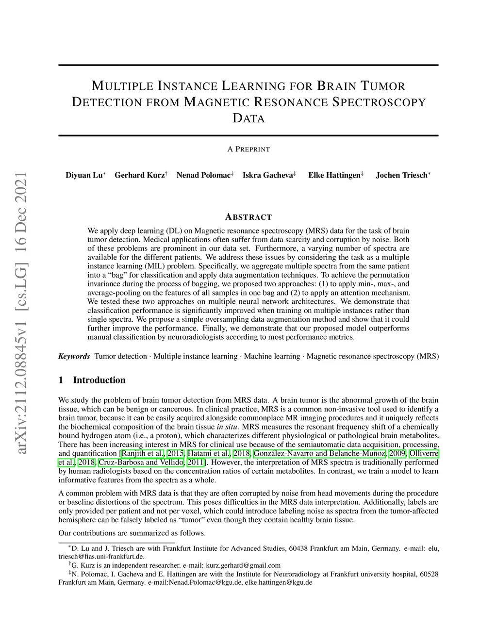 Multiple Instance Learning for Brain Tumor Detection from Magnetic