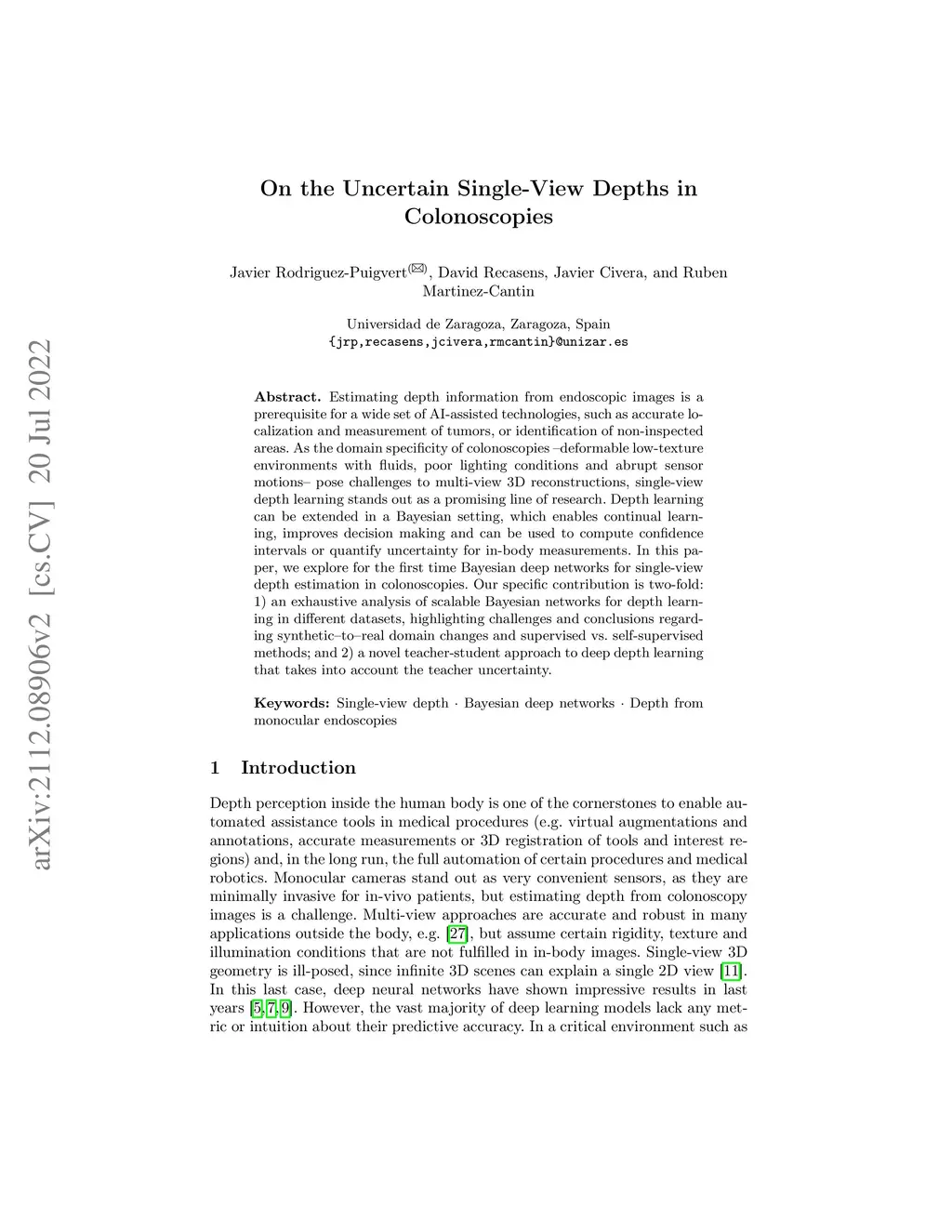 Estimating depth information from endoscopic images is a prerequisite for a wide set of AI-assisted technologies, such as accurate localization and measurement of tumors, or identification of non-inspected areas. As the domain specificity of colonoscopies -- deformable low-texture environments with fluids, poor lighting conditions and abrupt sensor motions -- pose challenges to multi-view 3D reconstructions, single-view depth learning stands out as a promising line of research. Depth learning can be extended in a Bayesian setting, which enables continual learning, improves decision making and can be used to compute confidence intervals or quantify uncertainty for in-body measurements. In this paper, we explore for the first time Bayesian deep networks for single-view depth estimation in colonoscopies. Our specific contribution is two-fold: 1) an exhaustive analysis of scalable Bayesian networks for depth learning in different datasets, highlighting challenges and conclusions regarding synthetic-to-real domain changes and supervised vs. self-supervised methods; and 2) a novel teacher-student approach to deep depth learning that takes into account the teacher uncertainty.