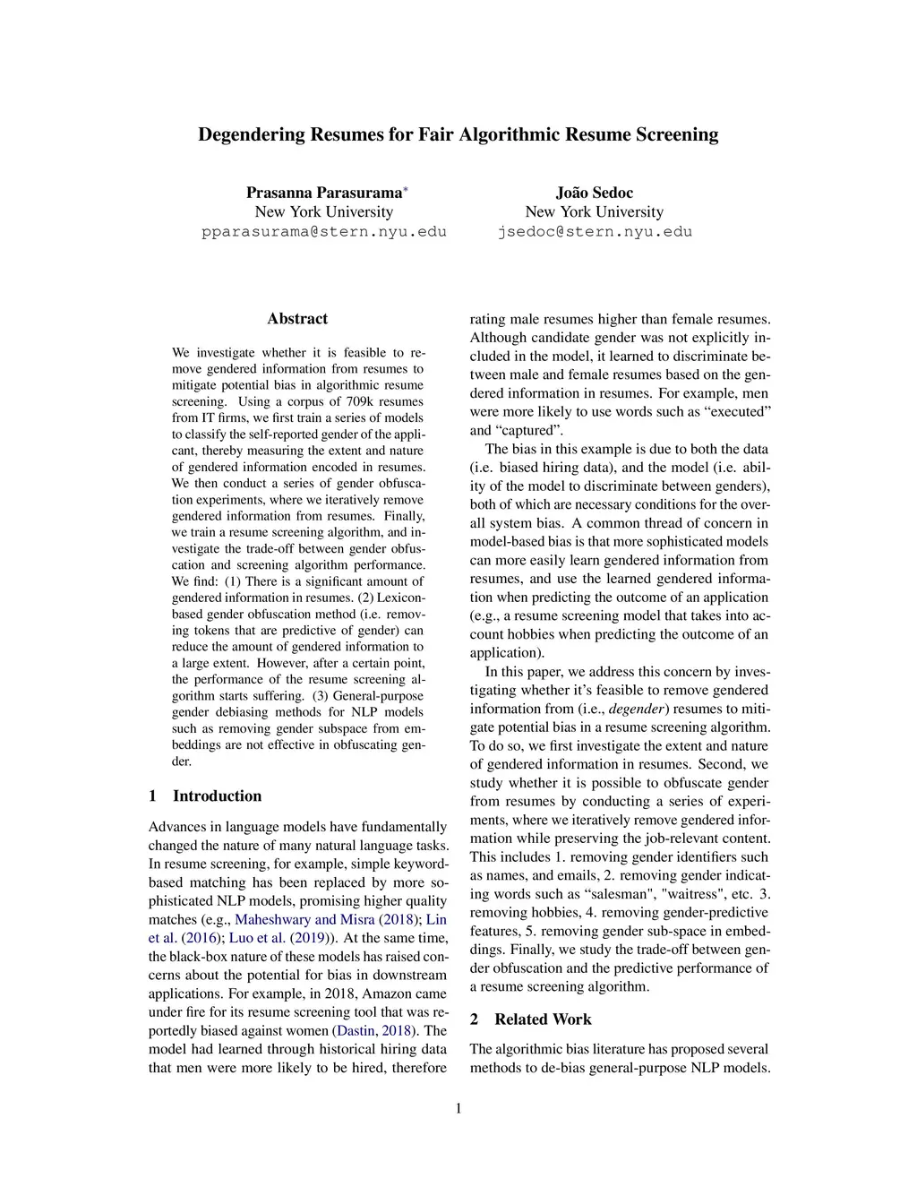 We investigate whether it is feasible to remove gendered information from resumes to mitigate potential bias in algorithmic resume screening. Using a corpus of 709k resumes from IT firms, we first train a series of models to classify the self-reported gender of the applicant, thereby measuring the extent and nature of gendered information encoded in resumes. We then conduct a series of gender obfuscation experiments, where we iteratively remove gendered information from resumes. Finally, we train a resume screening algorithm and investigate the trade-off between gender obfuscation and screening algorithm performance. Results show: (1) There is a significant amount of gendered information in resumes. (2) Lexicon-based gender obfuscation method (i.e. removing tokens that are predictive of gender) can reduce the amount of gendered information to a large extent. However, after a certain point, the performance of the resume screening algorithm starts suffering. (3) General-purpose gender debiasing methods for NLP models such as removing gender subspace from embeddings are not effective in obfuscating gender.