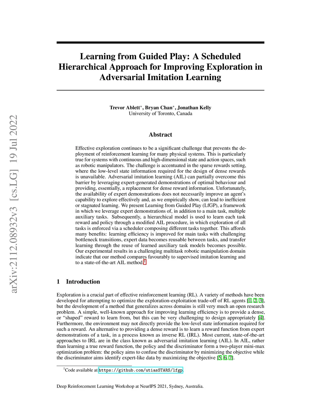 Effective exploration continues to be a significant challenge that prevents the deployment of reinforcement learning for many physical systems. This is particularly true for systems with continuous and high-dimensional state and action spaces, such as robotic manipulators. The challenge is accentuated in the sparse rewards setting, where the low-level state information required for the design of dense rewards is unavailable. Adversarial imitation learning (AIL) can partially overcome this barrier by leveraging expert-generated demonstrations of optimal behaviour and providing, essentially, a replacement for dense reward information. Unfortunately, the availability of expert demonstrations does not necessarily improve an agent's capability to explore effectively and, as we empirically show, can lead to inefficient or stagnated learning. We present Learning from Guided Play (LfGP), a framework in which we leverage expert demonstrations of, in addition to a main task, multiple auxiliary tasks. Subsequently, a hierarchical model is used to learn each task reward and policy through a modified AIL procedure, in which exploration of all tasks is enforced via a scheduler composing different tasks together. This affords many benefits: learning efficiency is improved for main tasks with challenging bottleneck transitions, expert data becomes reusable between tasks, and transfer learning through the reuse of learned auxiliary task models becomes possible. Our experimental results in a challenging multitask robotic manipulation domain indicate that our method compares favourably to supervised imitation learning and to a state-of-the-art AIL method. Code is available at https://github.com/utiasSTARS/lfgp.