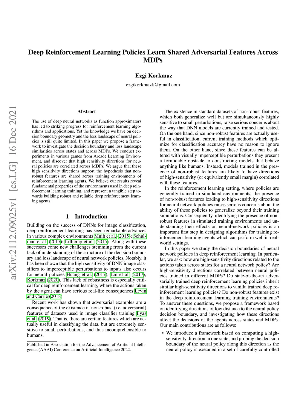 The use of deep neural networks as function approximators has led to striking progress for reinforcement learning algorithms and applications. Yet the knowledge we have on decision boundary geometry and the loss landscape of neural policies is still quite limited. In this paper we propose a framework to investigate the decision boundary and loss landscape similarities across states and across MDPs. We conduct experiments in various games from Arcade Learning Environment, and discover that high sensitivity directions for neural policies are correlated across MDPs. We argue that these high sensitivity directions support the hypothesis that non-robust features are shared across training environments of reinforcement learning agents. We believe our results reveal fundamental properties of the environments used in deep reinforcement learning training, and represent a tangible step towards building robust and reliable deep reinforcement learning agents.