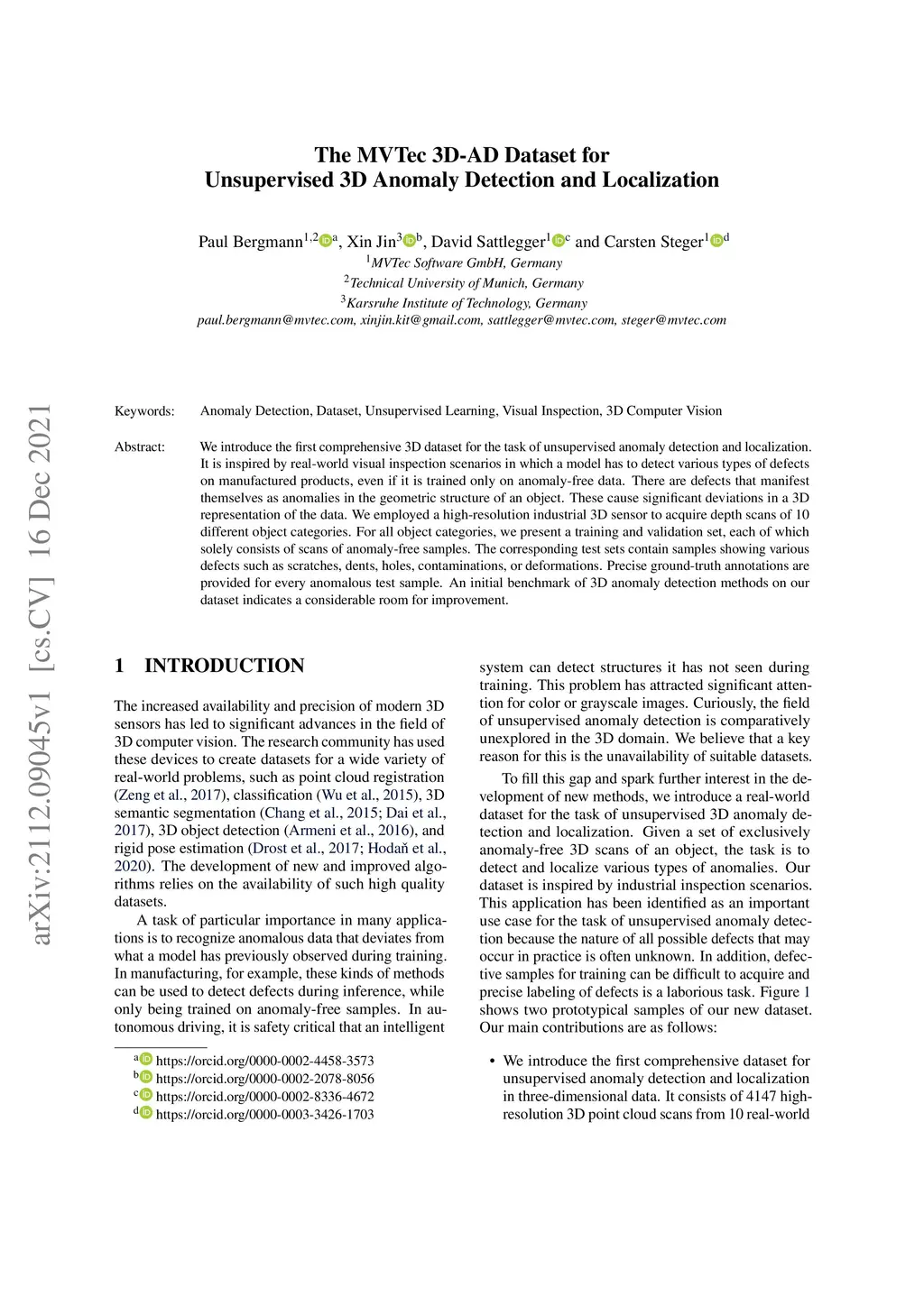 The MVTec 3D-AD Dataset for Unsupervised 3D Anomaly Detection and