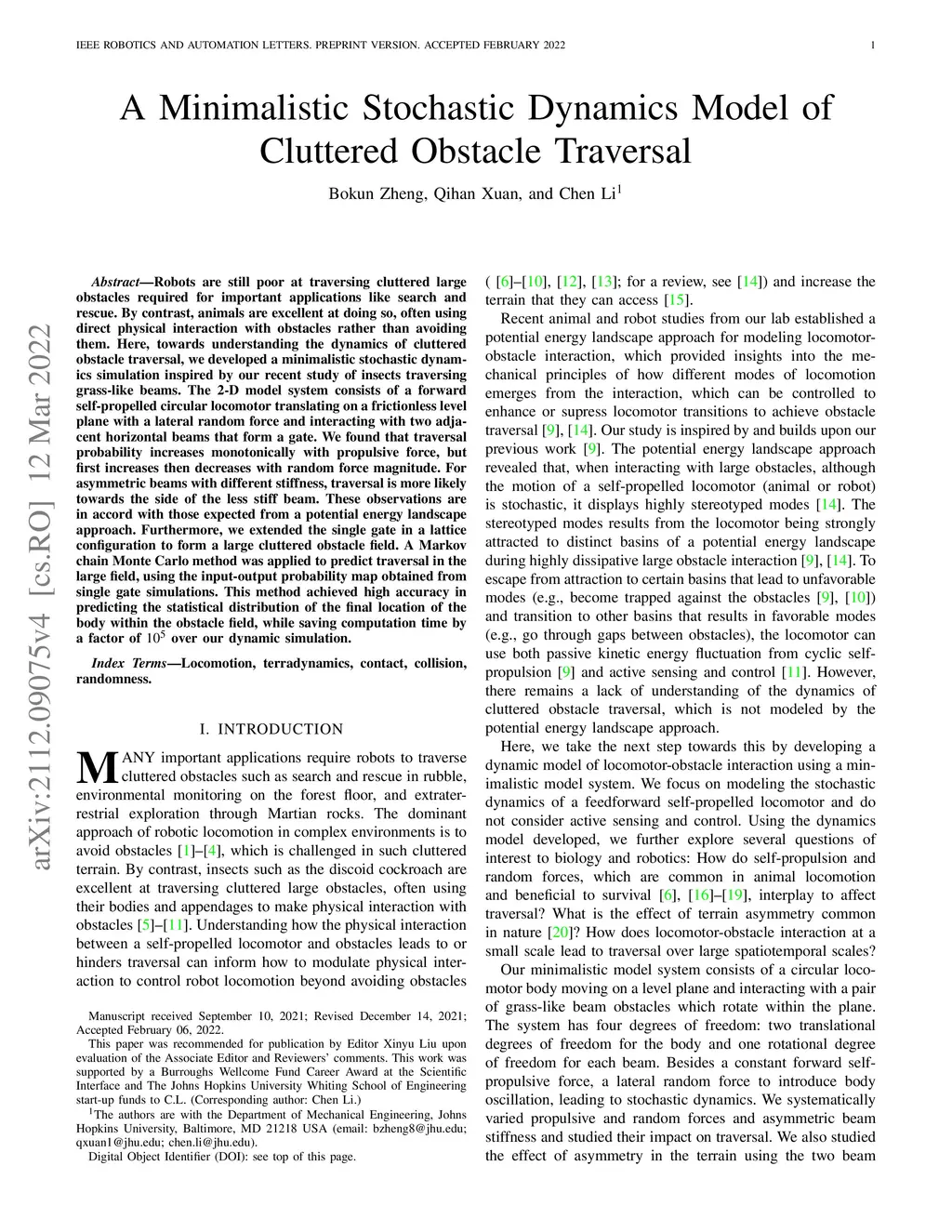 Robots are still poor at traversing cluttered large obstacles required for important applications like search and rescue. By contrast, animals are excellent at doing so, often using direct physical interaction with obstacles rather than avoiding them. Here, towards understanding the dynamics of cluttered obstacle traversal, we developed a minimalistic stochastic dynamics simulation inspired by our recent study of insects traversing grass-like beams. The 2-D model system consists of a forward self-propelled circular locomotor translating on a frictionless level plane with a lateral random force and interacting with two adjacent horizontal beams that form a gate. We found that traversal probability increases monotonically with propulsive force, but first increases then decreases with random force magnitude. For asymmetric beams with different stiffness, traversal is more likely towards the side of the less stiff beam. These observations are in accord with those expected from a potential energy landscape approach. Furthermore, we extended the single gate in a lattice configuration to form a large cluttered obstacle field. A Markov chain Monte Carlo method was applied to predict traversal in the large field, using the input-output probability map obtained from single gate simulations. This method achieved high accuracy in predicting the statistical distribution of the final location of the body within the obstacle field, while saving computation time by a factor of 10^5 over our dynamic simulation.