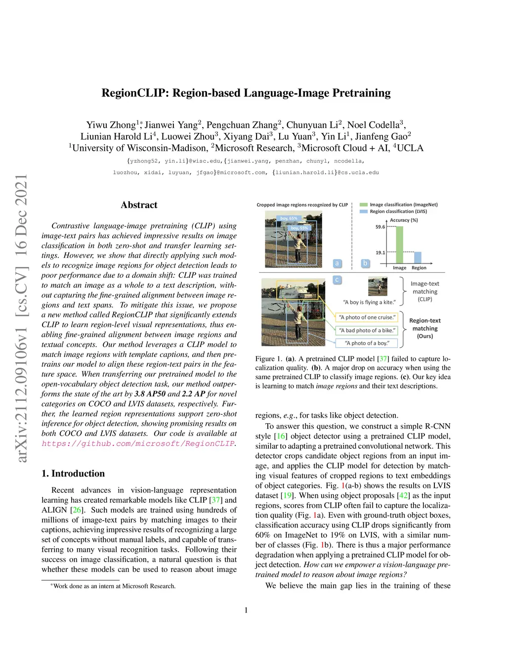 Contrastive language-image pretraining (CLIP) using image-text pairs has achieved impressive results on image classification in both zero-shot and transfer learning settings. However, we show that directly applying such models to recognize image regions for object detection leads to poor performance due to a domain shift: CLIP was trained to match an image as a whole to a text description, without capturing the fine-grained alignment between image regions and text spans. To mitigate this issue, we propose a new method called RegionCLIP that significantly extends CLIP to learn region-level visual representations, thus enabling fine-grained alignment between image regions and textual concepts. Our method leverages a CLIP model to match image regions with template captions and then pretrains our model to align these region-text pairs in the feature space. When transferring our pretrained model to the open-vocabulary object detection tasks, our method significantly outperforms the state of the art by 3.8 AP50 and 2.2 AP for novel categories on COCO and LVIS datasets, respectively. Moreoever, the learned region representations support zero-shot inference for object detection, showing promising results on both COCO and LVIS datasets. Our code is available at https://github.com/microsoft/RegionCLIP.