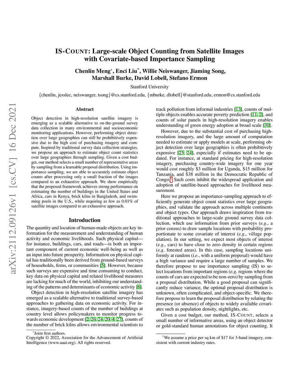 Object detection in high-resolution satellite imagery is emerging as a scalable alternative to on-the-ground survey data collection in many environmental and socioeconomic monitoring applications. However, performing object detection over large geographies can still be prohibitively expensive due to the high cost of purchasing imagery and compute. Inspired by traditional survey data collection strategies, we propose an approach to estimate object count statistics over large geographies through sampling. Given a cost budget, our method selects a small number of representative areas by sampling from a learnable proposal distribution. Using importance sampling, we are able to accurately estimate object counts after processing only a small fraction of the images compared to an exhaustive approach. We show empirically that the proposed framework achieves strong performance on estimating the number of buildings in the United States and Africa, cars in Kenya, brick kilns in Bangladesh, and swimming pools in the U.S., while requiring as few as 0.01% of satellite images compared to an exhaustive approach.
