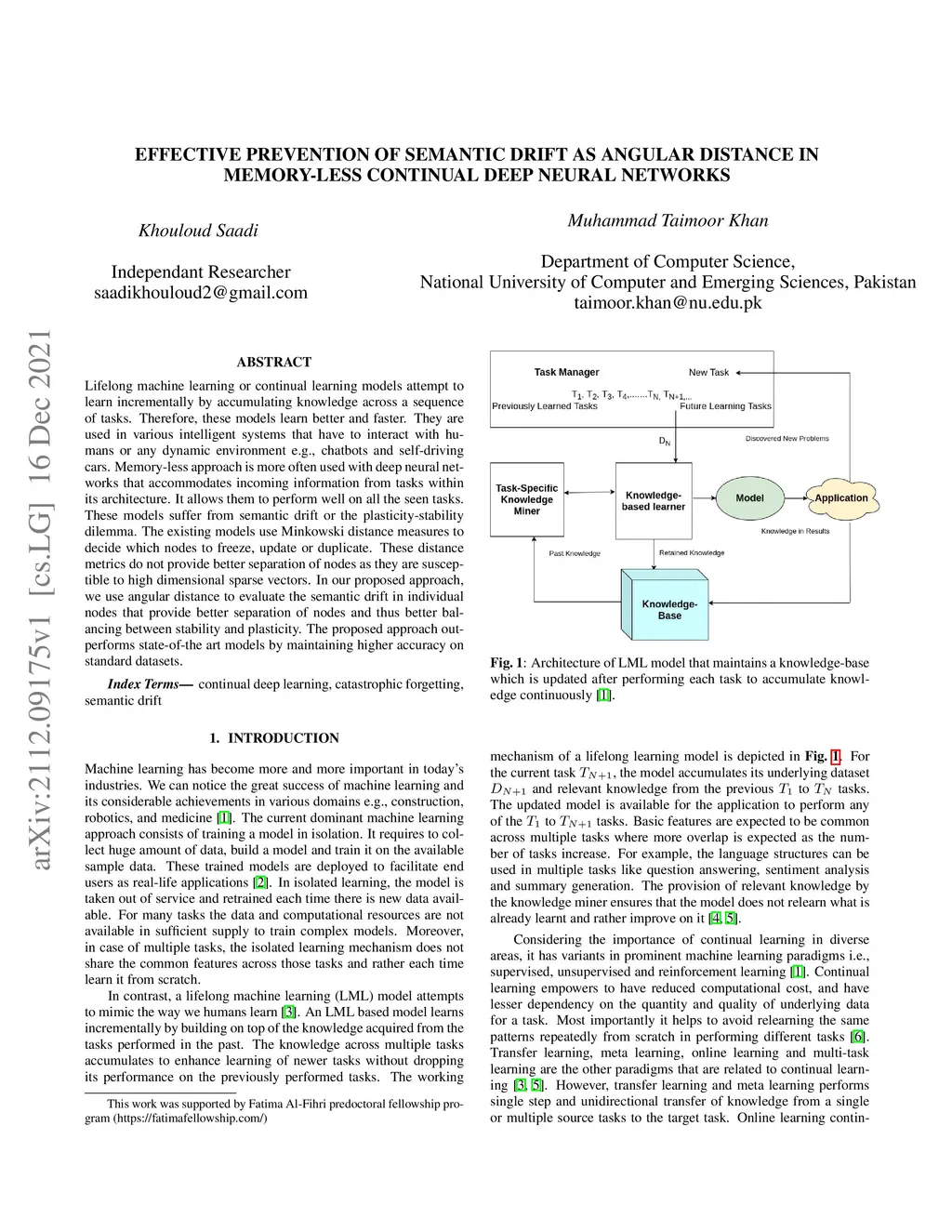 Lifelong machine learning or continual learning models attempt to learn incrementally by accumulating knowledge across a sequence of tasks. Therefore, these models learn better and faster. They are used in various intelligent systems that have to interact with humans or any dynamic environment e.g., chatbots and self-driving cars. Memory-less approach is more often used with deep neural networks that accommodates incoming information from tasks within its architecture. It allows them to perform well on all the seen tasks. These models suffer from semantic drift or the plasticity-stability dilemma. The existing models use Minkowski distance measures to decide which nodes to freeze, update or duplicate. These distance metrics do not provide better separation of nodes as they are susceptible to high dimensional sparse vectors. In our proposed approach, we use angular distance to evaluate the semantic drift in individual nodes that provide better separation of nodes and thus better balancing between stability and plasticity. The proposed approach outperforms state-of-the art models by maintaining higher accuracy on standard datasets.