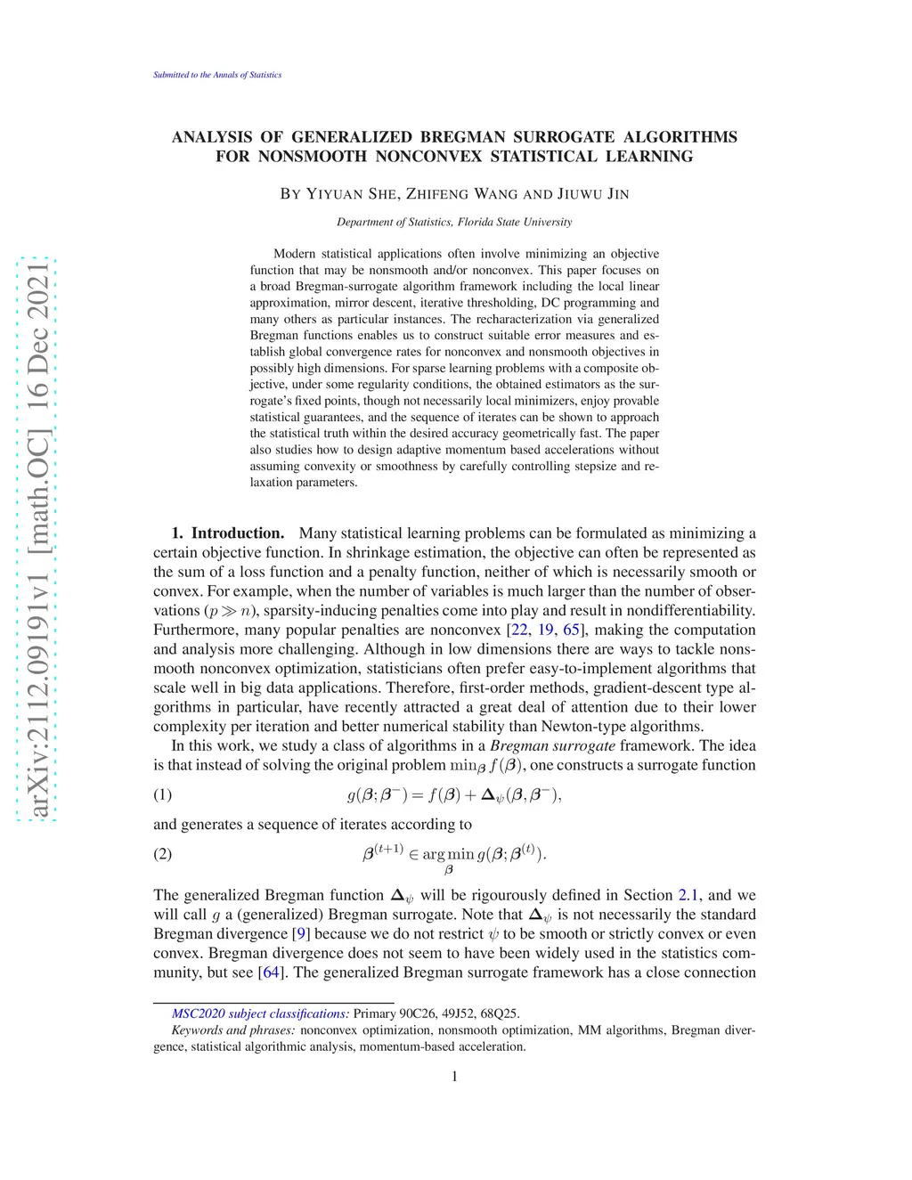 Modern statistical applications often involve minimizing an objective function that may be nonsmooth and/or nonconvex. This paper focuses on a broad Bregman-surrogate algorithm framework including the local linear approximation, mirror descent, iterative thresholding, DC programming and many others as particular instances. The recharacterization via generalized Bregman functions enables us to construct suitable error measures and establish global convergence rates for nonconvex and nonsmooth objectives in possibly high dimensions. For sparse learning problems with a composite objective, under some regularity conditions, the obtained estimators as the surrogate's fixed points, though not necessarily local minimizers, enjoy provable statistical guarantees, and the sequence of iterates can be shown to approach the statistical truth within the desired accuracy geometrically fast. The paper also studies how to design adaptive momentum based accelerations without assuming convexity or smoothness by carefully controlling stepsize and relaxation parameters.