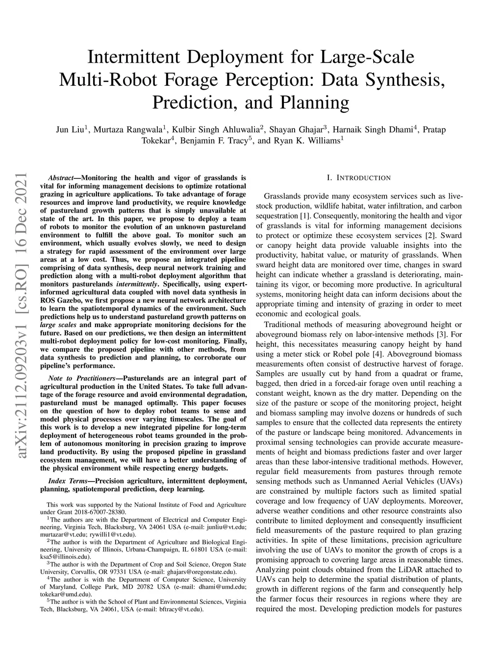 Monitoring the health and vigor of grasslands is vital for informing management decisions to optimize rotational grazing in agriculture applications. To take advantage of forage resources and improve land productivity, we require knowledge of pastureland growth patterns that is simply unavailable at state of the art. In this paper, we propose to deploy a team of robots to monitor the evolution of an unknown pastureland environment to fulfill the above goal. To monitor such an environment, which usually evolves slowly, we need to design a strategy for rapid assessment of the environment over large areas at a low cost. Thus, we propose an integrated pipeline comprising of data synthesis, deep neural network training and prediction along with a multi-robot deployment algorithm that monitors pasturelands intermittently. Specifically, using expert-informed agricultural data coupled with novel data synthesis in ROS Gazebo, we first propose a new neural network architecture to learn the spatiotemporal dynamics of the environment. Such predictions help us to understand pastureland growth patterns on large scales and make appropriate monitoring decisions for the future. Based on our predictions, we then design an intermittent multi-robot deployment policy for low-cost monitoring. Finally, we compare the proposed pipeline with other methods, from data synthesis to prediction and planning, to corroborate our pipeline's performance.