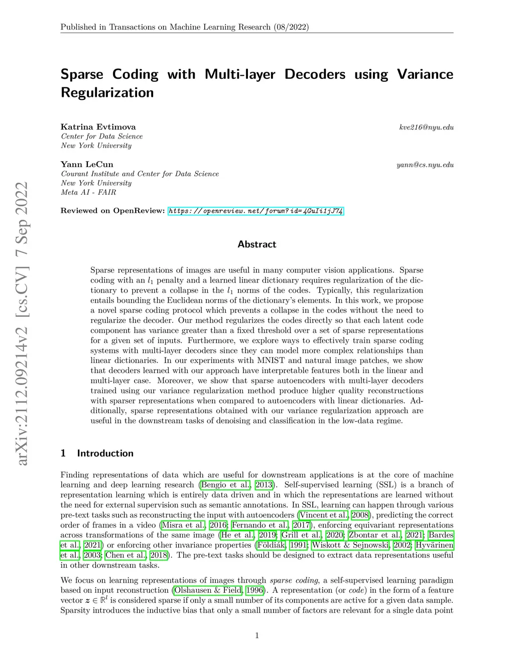 Sparse Coding with Multi-Layer Decoders using Variance Regularization