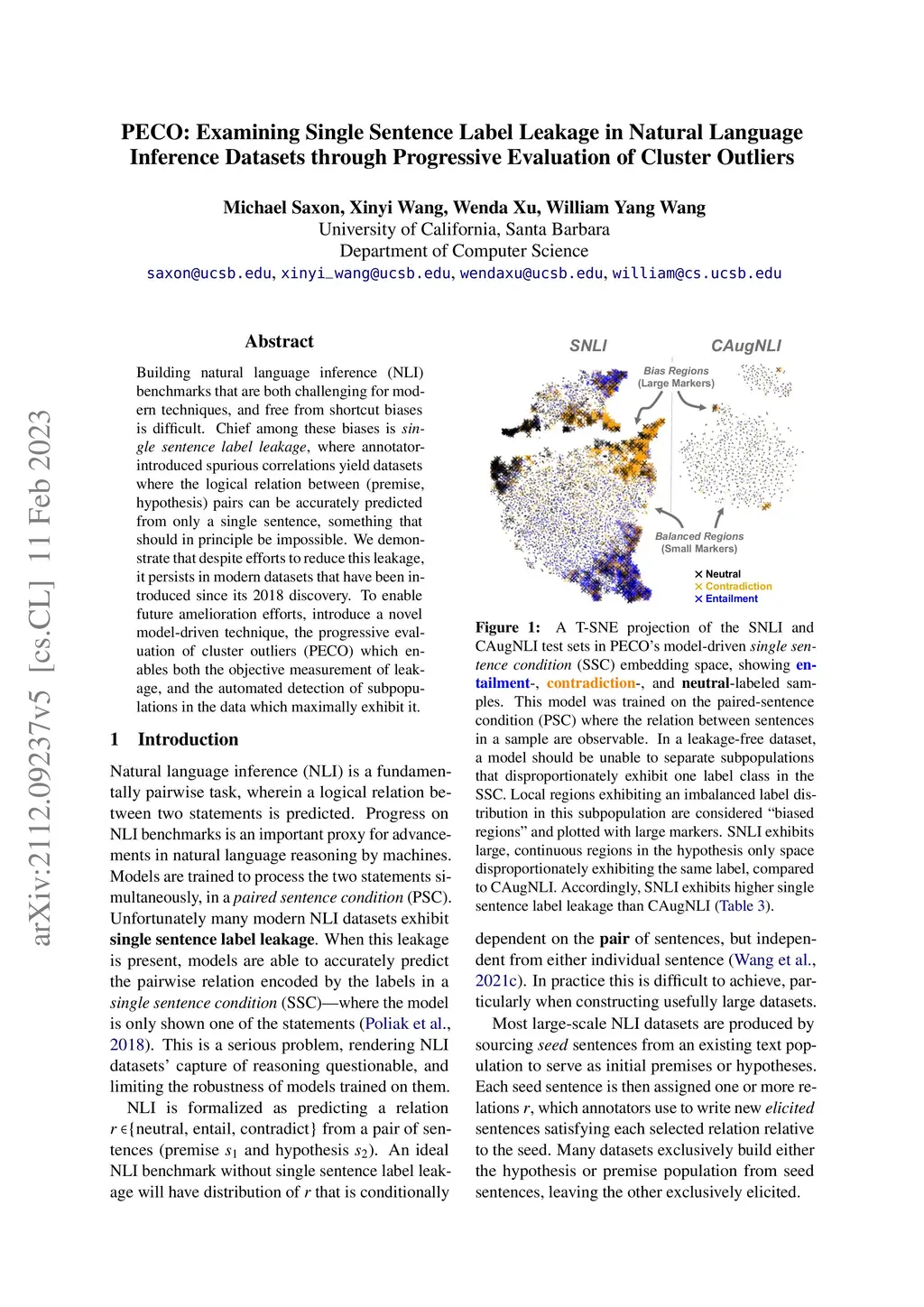 PECO: Examining Single Sentence Label Leakage in Natural Language