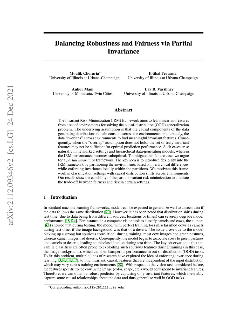 The Invariant Risk Minimization (IRM) framework aims to learn invariant features from a set of environments for solving the out-of-distribution (OOD) generalization problem. The underlying assumption is that the causal components of the data generating distributions remain constant across the environments or alternately, the data "overlaps" across environments to find meaningful invariant features. Consequently, when the "overlap" assumption does not hold, the set of truly invariant features may not be sufficient for optimal prediction performance. Such cases arise naturally in networked settings and hierarchical data-generating models, wherein the IRM performance becomes suboptimal. To mitigate this failure case, we argue for a partial invariance framework. The key idea is to introduce flexibility into the IRM framework by partitioning the environments based on hierarchical differences, while enforcing invariance locally within the partitions. We motivate this framework in classification settings with causal distribution shifts across environments. Our results show the capability of the partial invariant risk minimization to alleviate the trade-off between fairness and risk in certain settings.