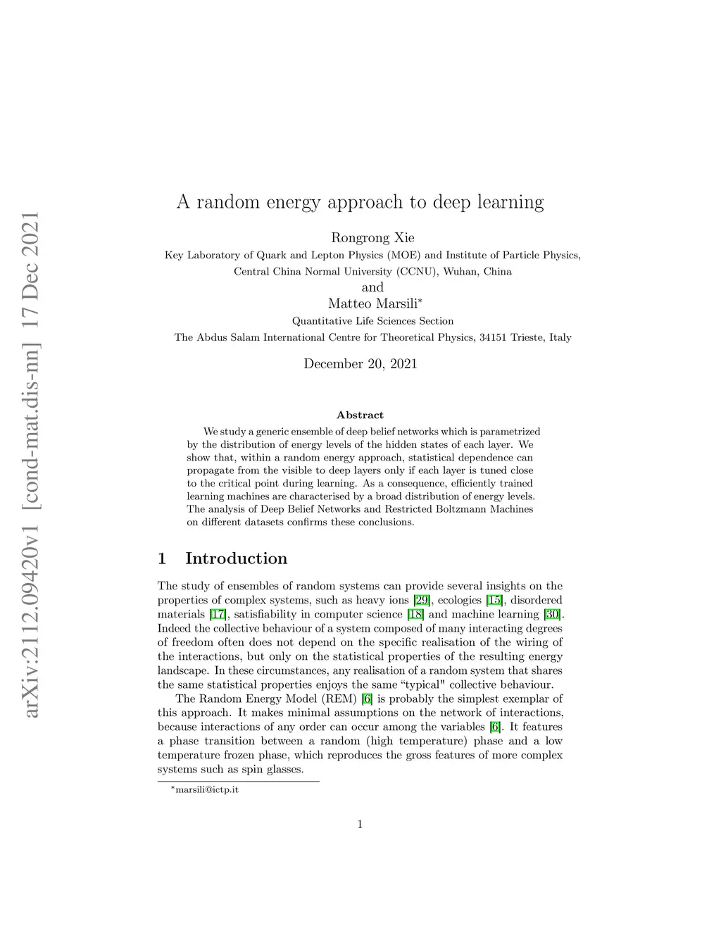We study a generic ensemble of deep belief networks which is parametrized by the distribution of energy levels of the hidden states of each layer. We show that, within a random energy approach, statistical dependence can propagate from the visible to deep layers only if each layer is tuned close to the critical point during learning. As a consequence, efficiently trained learning machines are characterised by a broad distribution of energy levels. The analysis of Deep Belief Networks and Restricted Boltzmann Machines on different datasets confirms these conclusions.