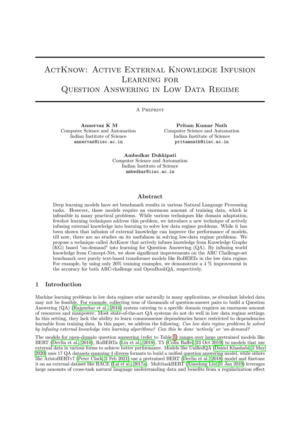 Deep learning models have set benchmark results in various Natural Language Processing tasks. However, these models require an enormous amount of training data, which is infeasible in many practical problems. While various techniques like domain adaptation, fewshot learning techniques address this problem, we introduce a new technique of actively infusing external knowledge into learning to solve low data regime problems. We propose a technique called ActKnow that actively infuses knowledge from Knowledge Graphs (KG) based "on-demand" into learning for Question Answering (QA). By infusing world knowledge from Concept-Net, we show significant improvements on the ARC Challenge-set benchmark over purely text-based transformer models like RoBERTa in the low data regime. For example, by using only 20% training examples, we demonstrate a 4% improvement in the accuracy for both ARC-challenge and OpenBookQA, respectively.