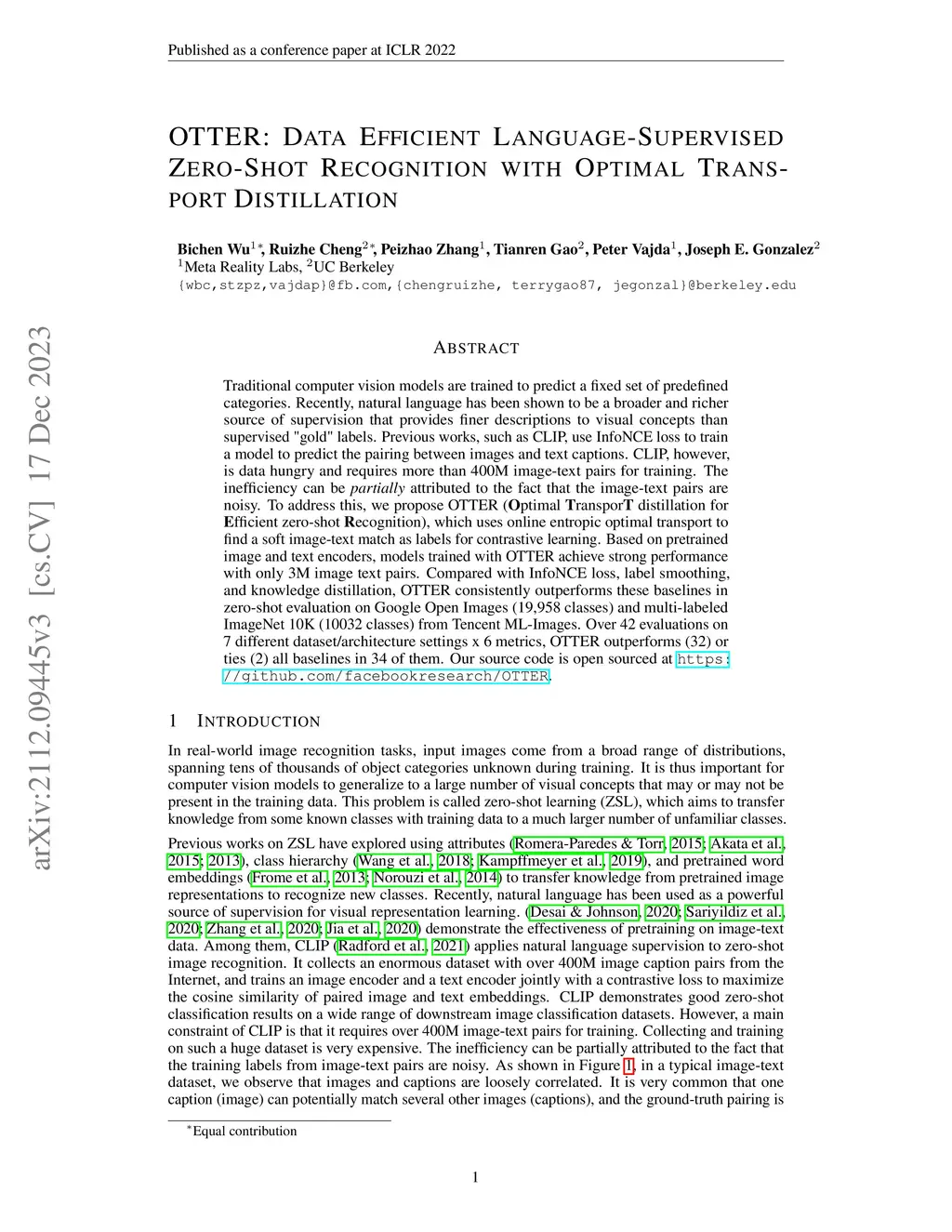 Traditional computer vision models are trained to predict a fixed set of predefined categories. Recently, natural language has been shown to be a broader and richer source of supervision that provides finer descriptions to visual concepts than supervised "gold" labels. Previous works, such as CLIP, use InfoNCE loss to train a model to predict the pairing between images and text captions. CLIP, however, is data hungry and requires more than 400M image-text pairs for training. The inefficiency can be partially attributed to the fact that the image-text pairs are noisy. To address this, we propose OTTER (Optimal TransporT distillation for Efficient zero-shot Recognition), which uses online entropic optimal transport to find a soft image-text match as labels for contrastive learning. Based on pretrained image and text encoders, models trained with OTTER achieve strong performance with only 3M image text pairs. Compared with InfoNCE loss, label smoothing, and knowledge distillation, OTTER consistently outperforms these baselines in zero shot evaluation on Google Open Images (19,958 classes) and multi-labeled ImageNet 10K (10032 classes) from Tencent ML-Images. Over 42 evaluations on 7 different dataset/architecture settings x 6 metrics, OTTER outperforms (32) or ties (2) all baselines in 34 of them.