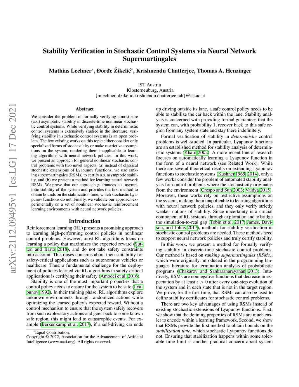 We consider the problem of formally verifying almost-sure (a.s.) asymptotic stability in discrete-time nonlinear stochastic control systems. While verifying stability in deterministic control systems is extensively studied in the literature, verifying stability in stochastic control systems is an open problem. The few existing works on this topic either consider only specialized forms of stochasticity or make restrictive assumptions on the system, rendering them inapplicable to learning algorithms with neural network policies. In this work, we present an approach for general nonlinear stochastic control problems with two novel aspects: (a) instead of classical stochastic extensions of Lyapunov functions, we use ranking supermartingales (RSMs) to certify a.s.~asymptotic stability, and (b) we present a method for learning neural network RSMs. We prove that our approach guarantees a.s.~asymptotic stability of the system and provides the first method to obtain bounds on the stabilization time, which stochastic Lyapunov functions do not. Finally, we validate our approach experimentally on a set of nonlinear stochastic reinforcement learning environments with neural network policies.