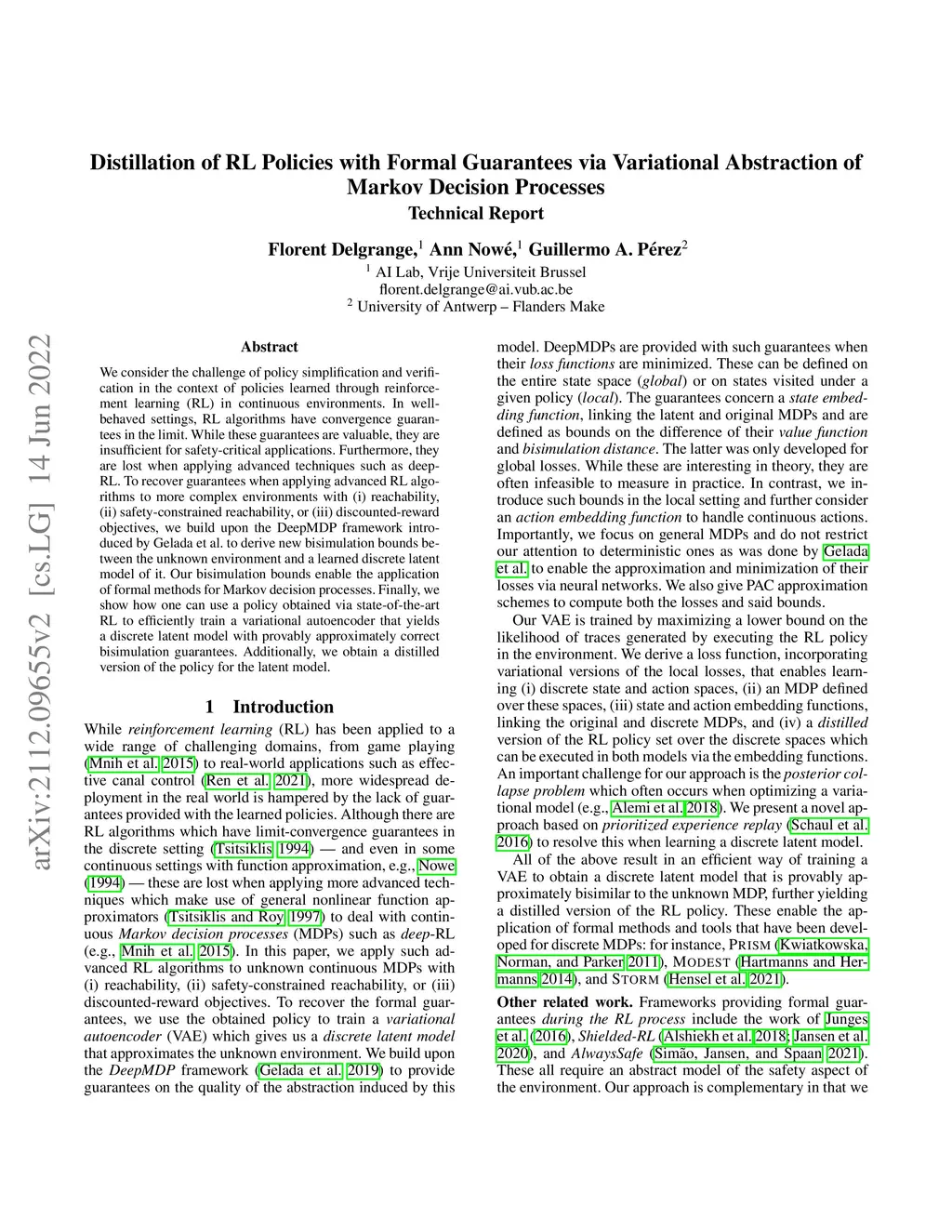 We consider the challenge of policy simplification and verification in the context of policies learned through reinforcement learning (RL) in continuous environments. In well-behaved settings, RL algorithms have convergence guarantees in the limit. While these guarantees are valuable, they are insufficient for safety-critical applications. Furthermore, they are lost when applying advanced techniques such as deep-RL. To recover guarantees when applying advanced RL algorithms to more complex environments with (i) reachability, (ii) safety-constrained reachability, or (iii) discounted-reward objectives, we build upon the DeepMDP framework introduced by Gelada et al. to derive new bisimulation bounds between the unknown environment and a learned discrete latent model of it. Our bisimulation bounds enable the application of formal methods for Markov decision processes. Finally, we show how one can use a policy obtained via state-of-the-art RL to efficiently train a variational autoencoder that yields a discrete latent model with provably approximately correct bisimulation guarantees. Additionally, we obtain a distilled version of the policy for the latent model.