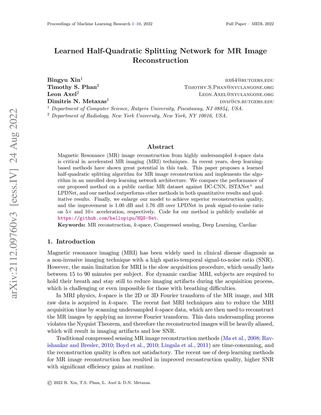 Magnetic Resonance (MR) image reconstruction from highly undersampled -space data is critical in accelerated MR imaging (MRI) techniques. In recent years, deep learning-based methods have shown great potential in this task. This paper proposes a learned half-quadratic splitting algorithm for MR image reconstruction and implements the algorithm in an unrolled deep learning network architecture. We compare the performance of our proposed method on a public cardiac MR dataset against DC-CNN and LPDNet, and our method outperforms other methods in both quantitative results and qualitative results with fewer model parameters and faster reconstruction speed. Finally, we enlarge our model to achieve superior reconstruction quality, and the improvement is dB and dB over LPDNet in peak signal-to-noise ratio on and acceleration, respectively. Code for our method is publicly available at https://github.com/hellopipu/HQS-Net.
