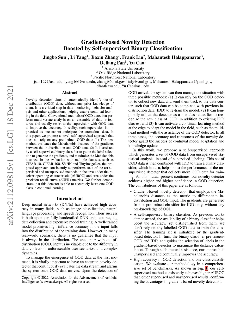 Novelty detection aims to automatically identify out-of-distribution (OOD) data, without any prior knowledge of them. It is a critical step in data monitoring, behavior analysis and other applications, helping enable continual learning in the field. Conventional methods of OOD detection perform multi-variate analysis on an ensemble of data or features, and usually resort to the supervision with OOD data to improve the accuracy. In reality, such supervision is impractical as one cannot anticipate the anomalous data. In this paper, we propose a novel, self-supervised approach that does not rely on any pre-defined OOD data: (1) The new method evaluates the Mahalanobis distance of the gradients between the in-distribution and OOD data. (2) It is assisted by a self-supervised binary classifier to guide the label selection to generate the gradients, and maximize the Mahalanobis distance. In the evaluation with multiple datasets, such as CIFAR-10, CIFAR-100, SVHN and TinyImageNet, the proposed approach consistently outperforms state-of-the-art supervised and unsupervised methods in the area under the receiver operating characteristic (AUROC) and area under the precision-recall curve (AUPR) metrics. We further demonstrate that this detector is able to accurately learn one OOD class in continual learning.