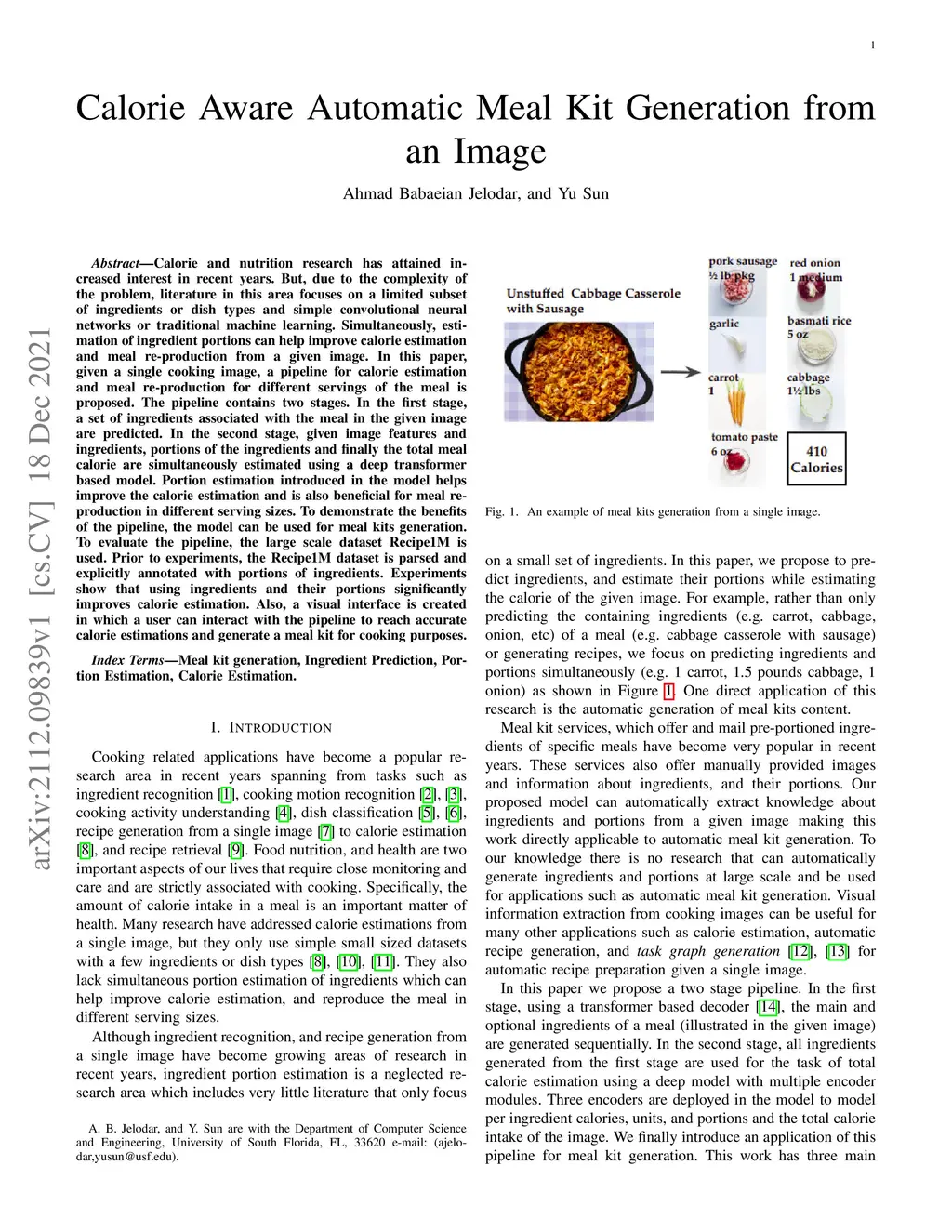 Calorie and nutrition research has attained increased interest in recent years. But, due to the complexity of the problem, literature in this area focuses on a limited subset of ingredients or dish types and simple convolutional neural networks or traditional machine learning. Simultaneously, estimation of ingredient portions can help improve calorie estimation and meal re-production from a given image. In this paper, given a single cooking image, a pipeline for calorie estimation and meal re-production for different servings of the meal is proposed. The pipeline contains two stages. In the first stage, a set of ingredients associated with the meal in the given image are predicted. In the second stage, given image features and ingredients, portions of the ingredients and finally the total meal calorie are simultaneously estimated using a deep transformer-based model. Portion estimation introduced in the model helps improve calorie estimation and is also beneficial for meal re-production in different serving sizes. To demonstrate the benefits of the pipeline, the model can be used for meal kits generation. To evaluate the pipeline, the large scale dataset Recipe1M is used. Prior to experiments, the Recipe1M dataset is parsed and explicitly annotated with portions of ingredients. Experiments show that using ingredients and their portions significantly improves calorie estimation. Also, a visual interface is created in which a user can interact with the pipeline to reach accurate calorie estimations and generate a meal kit for cooking purposes.