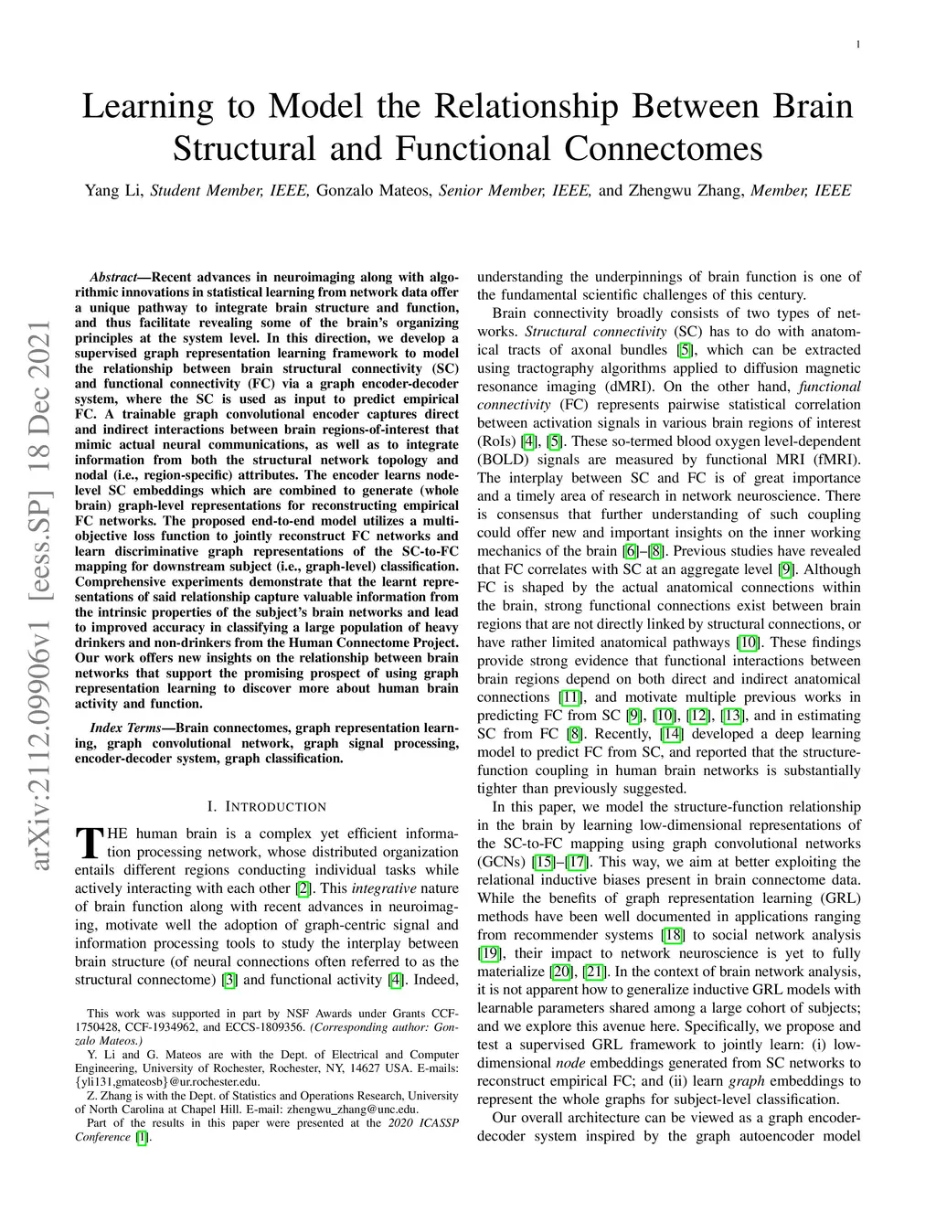Recent advances in neuroimaging along with algorithmic innovations in statistical learning from network data offer a unique pathway to integrate brain structure and function, and thus facilitate revealing some of the brain's organizing principles at the system level. In this direction, we develop a supervised graph representation learning framework to model the relationship between brain structural connectivity (SC) and functional connectivity (FC) via a graph encoder-decoder system, where the SC is used as input to predict empirical FC. A trainable graph convolutional encoder captures direct and indirect interactions between brain regions-of-interest that mimic actual neural communications, as well as to integrate information from both the structural network topology and nodal (i.e., region-specific) attributes. The encoder learns node-level SC embeddings which are combined to generate (whole brain) graph-level representations for reconstructing empirical FC networks. The proposed end-to-end model utilizes a multi-objective loss function to jointly reconstruct FC networks and learn discriminative graph representations of the SC-to-FC mapping for downstream subject (i.e., graph-level) classification. Comprehensive experiments demonstrate that the learnt representations of said relationship capture valuable information from the intrinsic properties of the subject's brain networks and lead to improved accuracy in classifying a large population of heavy drinkers and non-drinkers from the Human Connectome Project. Our work offers new insights on the relationship between brain networks that support the promising prospect of using graph representation learning to discover more about human brain activity and function.