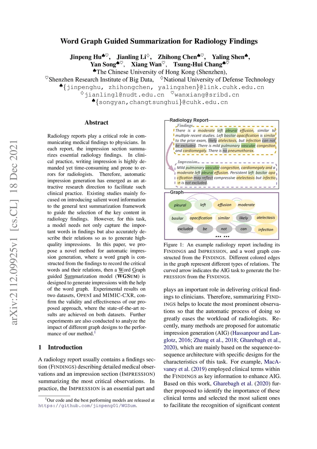 Radiology reports play a critical role in communicating medical findings to physicians. In each report, the impression section summarizes essential radiology findings. In clinical practice, writing impression is highly demanded yet time-consuming and prone to errors for radiologists. Therefore, automatic impression generation has emerged as an attractive research direction to facilitate such clinical practice. Existing studies mainly focused on introducing salient word information to the general text summarization framework to guide the selection of the key content in radiology findings. However, for this task, a model needs not only capture the important words in findings but also accurately describe their relations so as to generate high-quality impressions. In this paper, we propose a novel method for automatic impression generation, where a word graph is constructed from the findings to record the critical words and their relations, then a Word Graph guided Summarization model (WGSum) is designed to generate impressions with the help of the word graph. Experimental results on two datasets, OpenI and MIMIC-CXR, confirm the validity and effectiveness of our proposed approach, where the state-of-the-art results are achieved on both datasets. Further experiments are also conducted to analyze the impact of different graph designs to the performance of our method.
