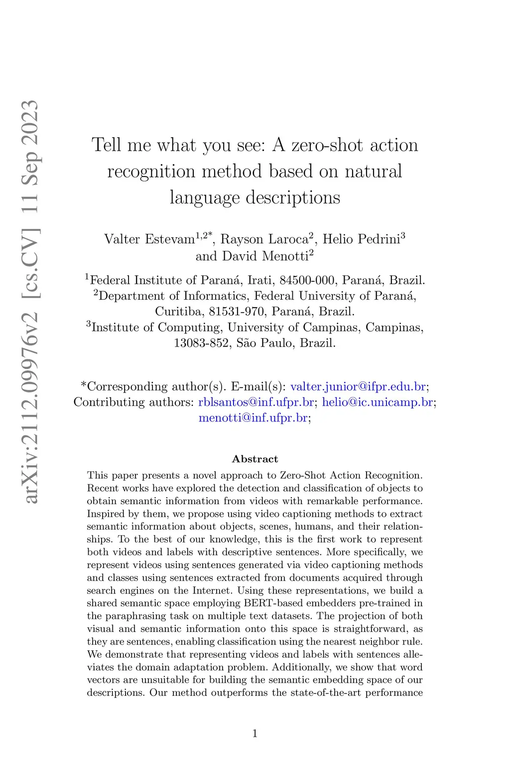 This paper presents a novel approach to Zero-Shot Action Recognition. Recent works have explored the detection and classification of objects to obtain semantic information from videos with remarkable performance. Inspired by them, we propose using video captioning methods to extract semantic information about objects, scenes, humans, and their relationships. To the best of our knowledge, this is the first work to represent both videos and labels with descriptive sentences. More specifically, we represent videos using sentences generated via video captioning methods and classes using sentences extracted from documents acquired through search engines on the Internet. Using these representations, we build a shared semantic space employing BERT-based embedders pre-trained in the paraphrasing task on multiple text datasets. The projection of both visual and semantic information onto this space is straightforward, as they are sentences, enabling classification using the nearest neighbor rule. We demonstrate that representing videos and labels with sentences alleviates the domain adaptation problem. Additionally, we show that word vectors are unsuitable for building the semantic embedding space of our descriptions. Our method outperforms the state-of-the-art performance on the UCF101 dataset by 3.3 p.p. in accuracy under the TruZe protocol and achieves competitive results on both the UCF101 and HMDB51 datasets under the conventional protocol (0/50\% - training/testing split). Our code is available at https://github.com/valterlej/zsarcap.