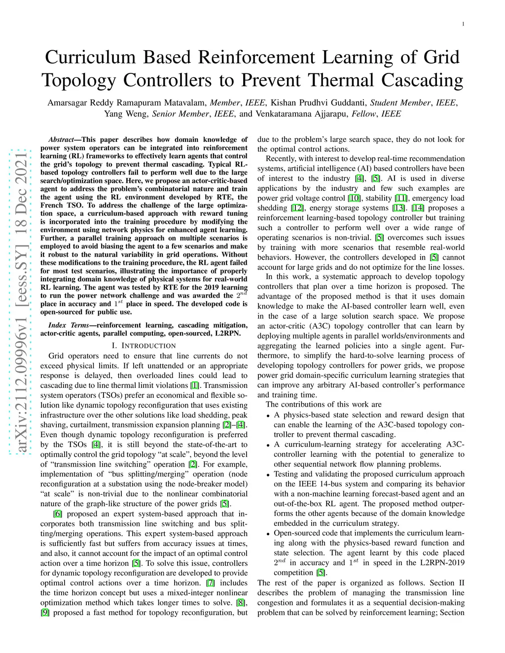 This paper describes how domain knowledge of power system operators can be integrated into reinforcement learning (RL) frameworks to effectively learn agents that control the grid's topology to prevent thermal cascading. Typical RL-based topology controllers fail to perform well due to the large search/optimization space. Here, we propose an actor-critic-based agent to address the problem's combinatorial nature and train the agent using the RL environment developed by RTE, the French TSO. To address the challenge of the large optimization space, a curriculum-based approach with reward tuning is incorporated into the training procedure by modifying the environment using network physics for enhanced agent learning. Further, a parallel training approach on multiple scenarios is employed to avoid biasing the agent to a few scenarios and make it robust to the natural variability in grid operations. Without these modifications to the training procedure, the RL agent failed for most test scenarios, illustrating the importance of properly integrating domain knowledge of physical systems for real-world RL learning. The agent was tested by RTE for the 2019 learning to run the power network challenge and was awarded the 2nd place in accuracy and 1st place in speed. The developed code is open-sourced for public use.