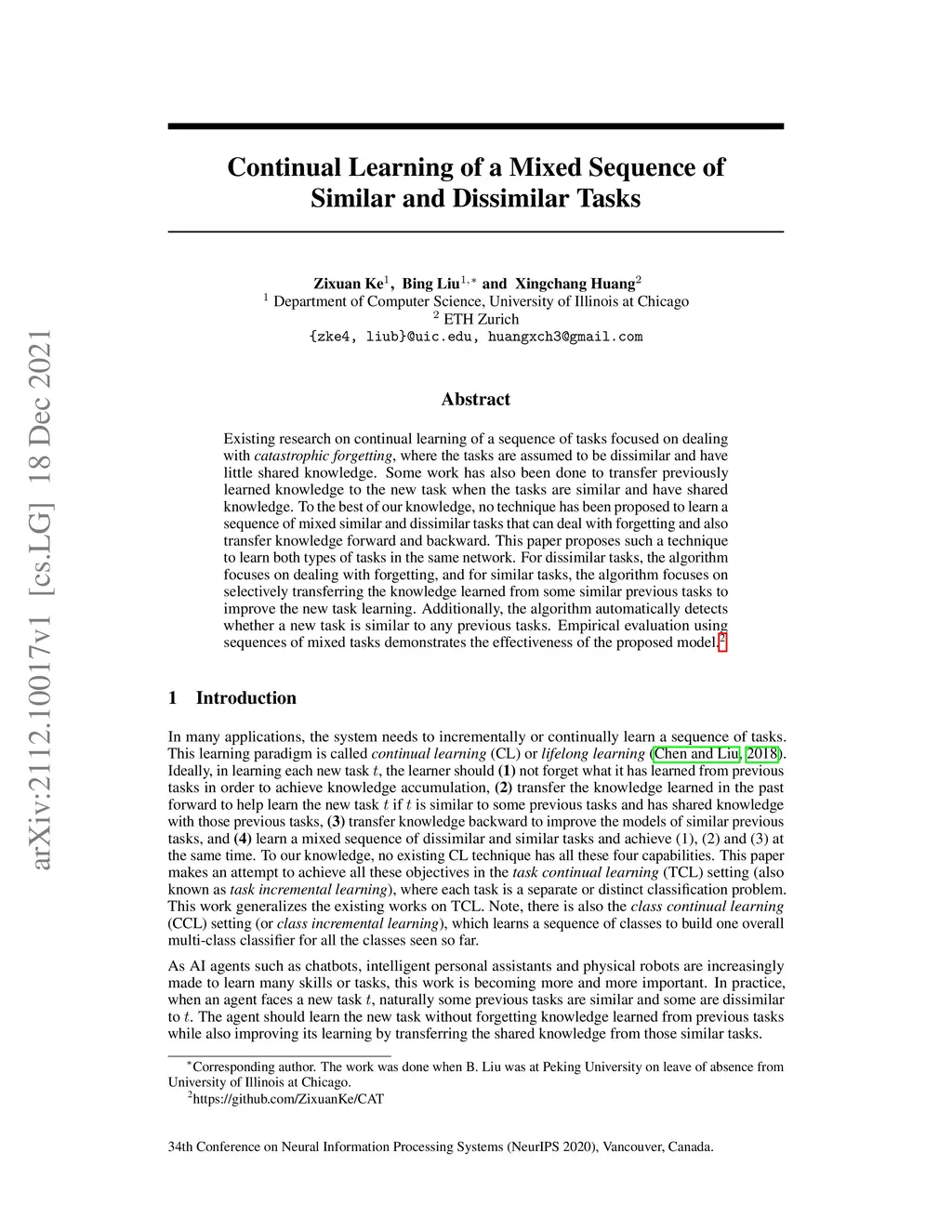 Existing research on continual learning of a sequence of tasks focused on dealing with catastrophic forgetting, where the tasks are assumed to be dissimilar and have little shared knowledge. Some work has also been done to transfer previously learned knowledge to the new task when the tasks are similar and have shared knowledge. To the best of our knowledge, no technique has been proposed to learn a sequence of mixed similar and dissimilar tasks that can deal with forgetting and also transfer knowledge forward and backward. This paper proposes such a technique to learn both types of tasks in the same network. For dissimilar tasks, the algorithm focuses on dealing with forgetting, and for similar tasks, the algorithm focuses on selectively transferring the knowledge learned from some similar previous tasks to improve the new task learning. Additionally, the algorithm automatically detects whether a new task is similar to any previous tasks. Empirical evaluation using sequences of mixed tasks demonstrates the effectiveness of the proposed model.