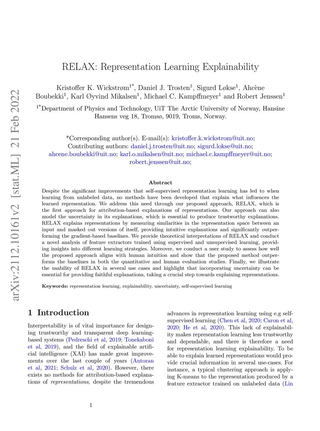 Despite the significant improvements that representation learning via self-supervision has led to when learning from unlabeled data, no methods exist that explain what influences the learned representation. We address this need through our proposed approach, RELAX, which is the first approach for attribution-based explanations of representations. Our approach can also model the uncertainty in its explanations, which is essential to produce trustworthy explanations. RELAX explains representations by measuring similarities in the representation space between an input and masked out versions of itself, providing intuitive explanations and significantly outperforming the gradient-based baseline. We provide theoretical interpretations of RELAX and conduct a novel analysis of feature extractors trained using supervised and unsupervised learning, providing insights into different learning strategies. Finally, we illustrate the usability of RELAX in multi-view clustering and highlight that incorporating uncertainty can be essential for providing low-complexity explanations, taking a crucial step towards explaining representations.