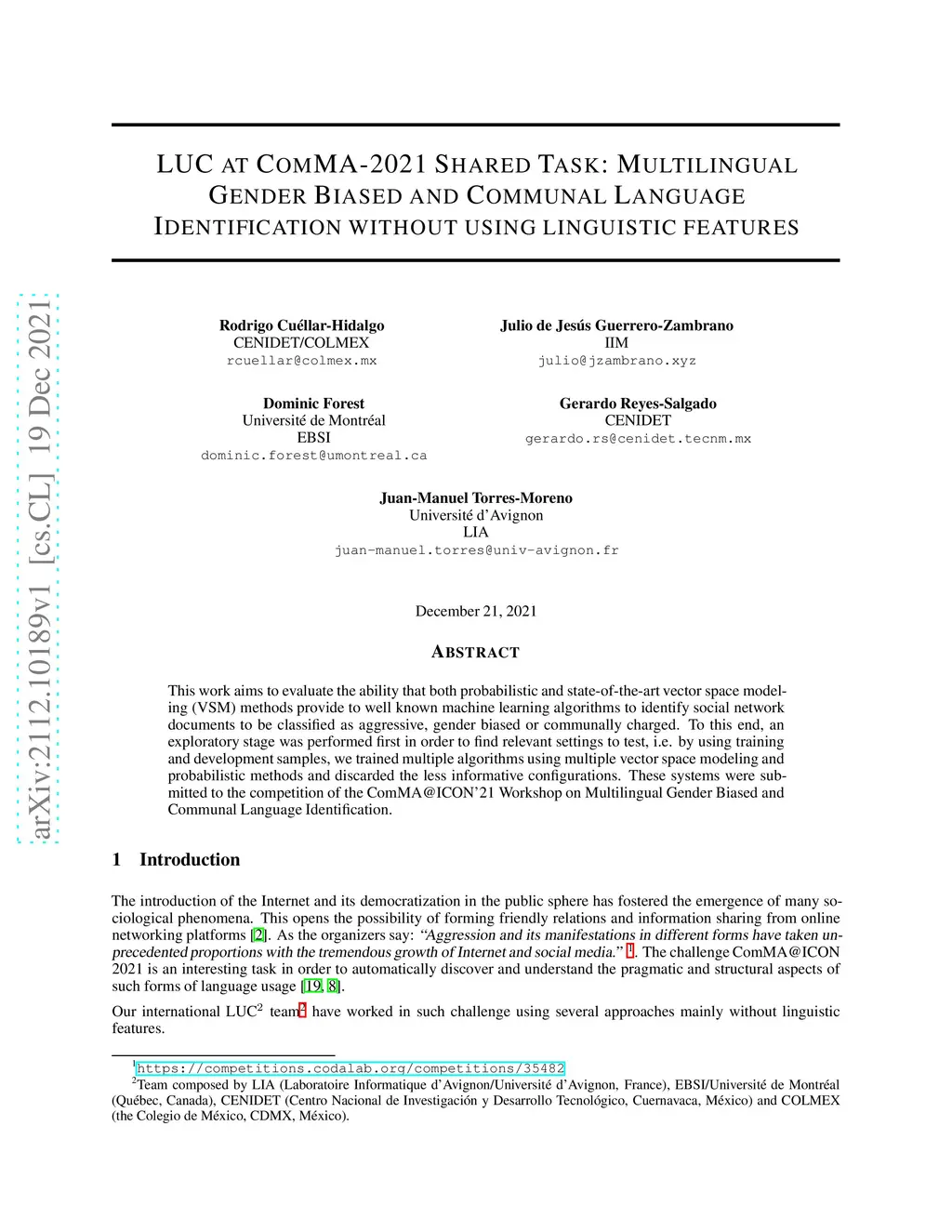 LUC at ComMA-2021 Shared Task: Multilingual Gender Biased and Communal