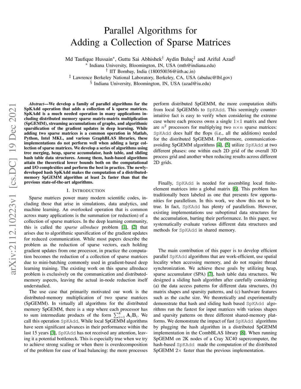 We develop a family of parallel algorithms for the SpKAdd operation that adds a collection of k sparse matrices. SpKAdd is a much needed operation in many applications including distributed memory sparse matrix-matrix multiplication (SpGEMM), streaming accumulations of graphs, and algorithmic sparsification of the gradient updates in deep learning. While adding two sparse matrices is a common operation in Matlab, Python, Intel MKL, and various GraphBLAS libraries, these implementations do not perform well when adding a large collection of sparse matrices. We develop a series of algorithms using tree merging, heap, sparse accumulator, hash table, and sliding hash table data structures. Among them, hash-based algorithms attain the theoretical lower bounds both on the computational and I/O complexities and perform the best in practice. The newly-developed hash SpKAdd makes the computation of a distributed-memory SpGEMM algorithm at least 2x faster than that the previous state-of-the-art algorithms.