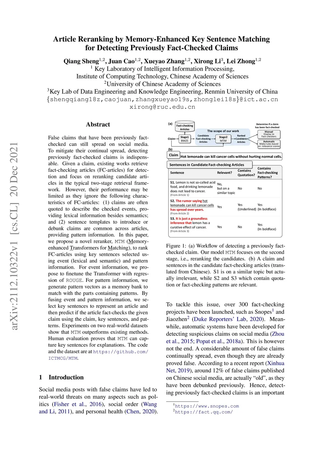 Article Reranking by Memory-Enhanced Key Sentence Matching for Detecting