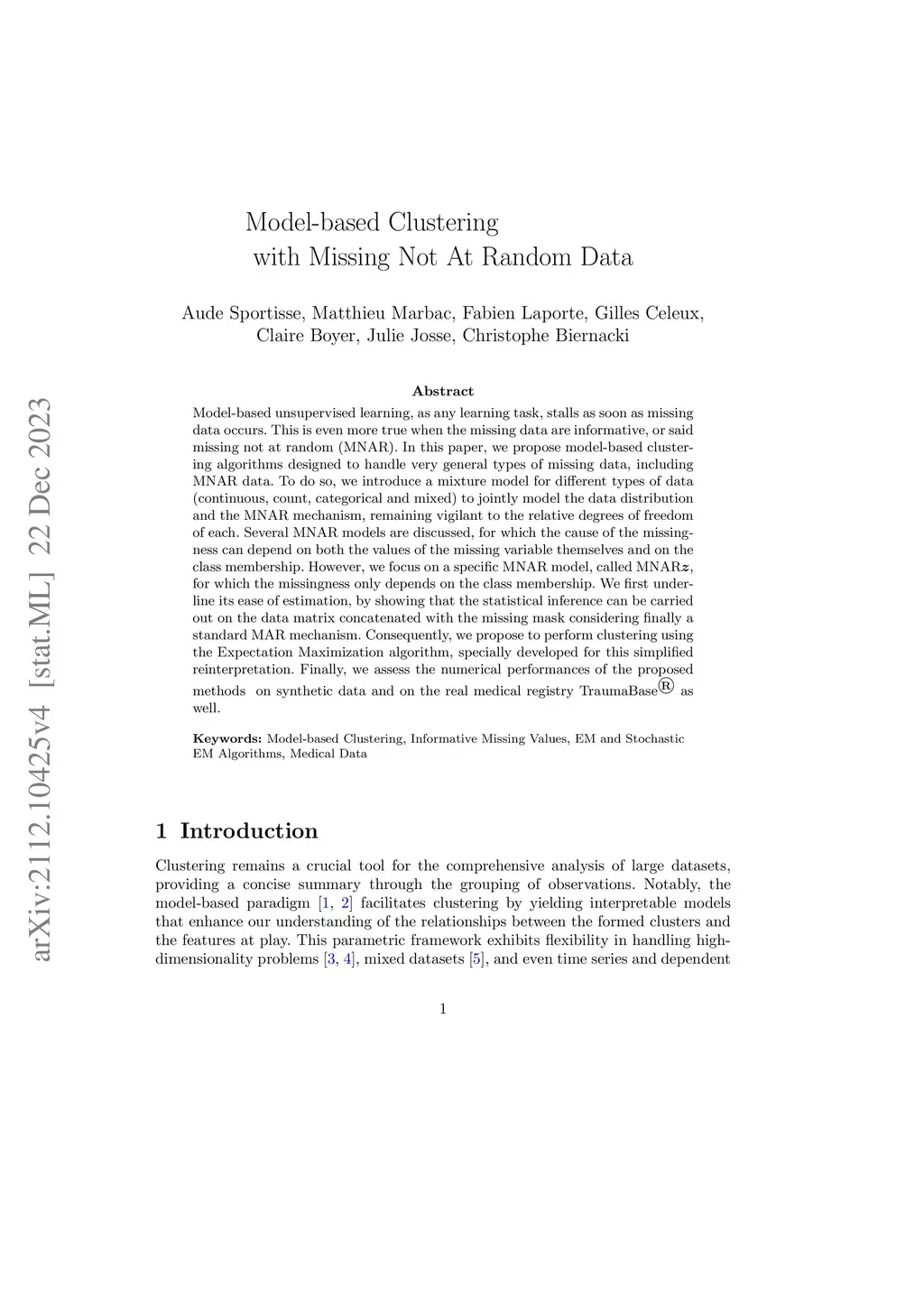 Model-based unsupervised learning, as any learning task, stalls as soon as missing data occurs. This is even more true when the missing data are informative, or said missing not at random (MNAR). In this paper, we propose model-based clustering algorithms designed to handle very general types of missing data, including MNAR data. To do so, we introduce a mixture model for different types of data (continuous, count, categorical and mixed) to jointly model the data distribution and the MNAR mechanism, remaining vigilant to the relative degrees of freedom of each. Several MNAR models are discussed, for which the cause of the missingness can depend on both the values of the missing variable themselves and on the class membership. However, we focus on a specific MNAR model, called MNARz, for which the missingness only depends on the class membership. We first underline its ease of estimation, by showing that the statistical inference can be carried out on the data matrix concatenated with the missing mask considering finally a standard MAR mechanism. Consequently, we propose to perform clustering using the Expectation Maximization algorithm, specially developed for this simplified reinterpretation. Finally, we assess the numerical performances of the proposed methods on synthetic data and on the real medical registry TraumaBase as well.