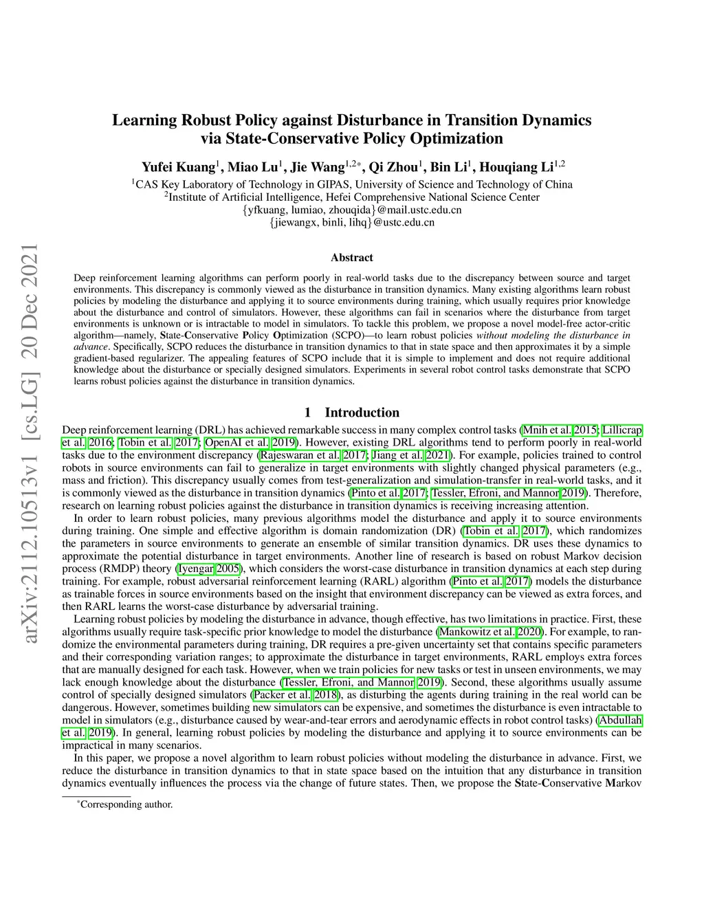Deep reinforcement learning algorithms can perform poorly in real-world tasks due to the discrepancy between source and target environments. This discrepancy is commonly viewed as the disturbance in transition dynamics. Many existing algorithms learn robust policies by modeling the disturbance and applying it to source environments during training, which usually requires prior knowledge about the disturbance and control of simulators. However, these algorithms can fail in scenarios where the disturbance from target environments is unknown or is intractable to model in simulators. To tackle this problem, we propose a novel model-free actor-critic algorithm -- namely, state-conservative policy optimization (SCPO) -- to learn robust policies without modeling the disturbance in advance. Specifically, SCPO reduces the disturbance in transition dynamics to that in state space and then approximates it by a simple gradient-based regularizer. The appealing features of SCPO include that it is simple to implement and does not require additional knowledge about the disturbance or specially designed simulators. Experiments in several robot control tasks demonstrate that SCPO learns robust policies against the disturbance in transition dynamics.
