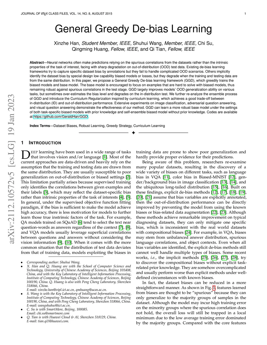 Neural networks often make predictions relying on the spurious correlations from the datasets rather than the intrinsic properties of the task of interest, facing sharp degradation on out-of-distribution (OOD) test data. Existing de-bias learning frameworks try to capture specific dataset bias by annotations but they fail to handle complicated OOD scenarios. Others implicitly identify the dataset bias by special design low capability biased models or losses, but they degrade when the training and testing data are from the same distribution. In this paper, we propose a General Greedy De-bias learning framework (GGD), which greedily trains the biased models and the base model. The base model is encouraged to focus on examples that are hard to solve with biased models, thus remaining robust against spurious correlations in the test stage. GGD largely improves models' OOD generalization ability on various tasks, but sometimes over-estimates the bias level and degrades on the in-distribution test. We further re-analyze the ensemble process of GGD and introduce the Curriculum Regularization inspired by curriculum learning, which achieves a good trade-off between in-distribution and out-of-distribution performance. Extensive experiments on image classification, adversarial question answering, and visual question answering demonstrate the effectiveness of our method. GGD can learn a more robust base model under the settings of both task-specific biased models with prior knowledge and self-ensemble biased model without prior knowledge.