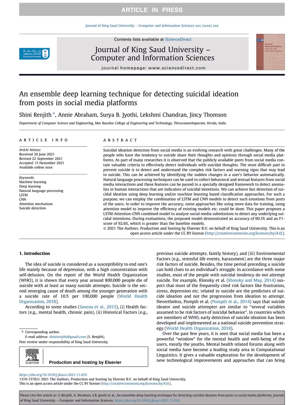 An ensemble deep learning technique for detecting suicidal ideation from