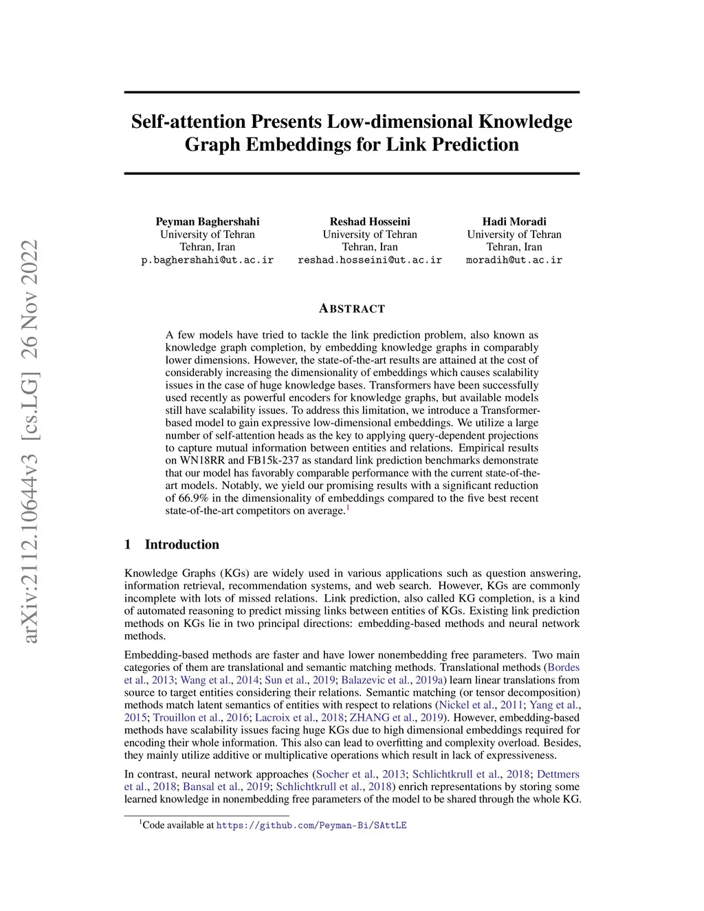 Self-attention Presents Low-dimensional Knowledge Graph Embeddings for
