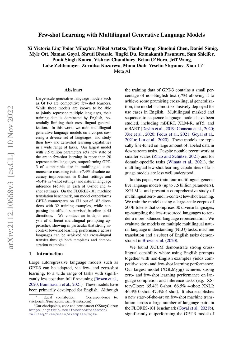 Large-scale generative language models such as GPT-3 are competitive few-shot learners. While these models are known to be able to jointly represent many different languages, their training data is dominated by English, potentially limiting their cross-lingual generalization. In this work, we train multilingual generative language models on a corpus covering a diverse set of languages, and study their few- and zero-shot learning capabilities in a wide range of tasks. Our largest model with 7.5 billion parameters sets new state of the art in few-shot learning in more than 20 representative languages, outperforming GPT-3 of comparable size in multilingual commonsense reasoning (with +7.4% absolute accuracy improvement in 0-shot settings and +9.4% in 4-shot settings) and natural language inference (+5.4% in each of 0-shot and 4-shot settings). On the FLORES-101 machine translation benchmark, our model outperforms GPT-3 on 171 out of 182 directions with 32 training examples, while surpassing the official supervised baseline in 45 directions. We conduct an in-depth analysis of different multilingual prompting approaches, showing in particular that strong few-shot learning performance across languages can be achieved via cross-lingual transfer through both templates and demonstration examples. Finally, we evaluate our models in social value tasks such as hate speech detection in five languages and find it has limitations similar to comparable sized GPT-3 models.