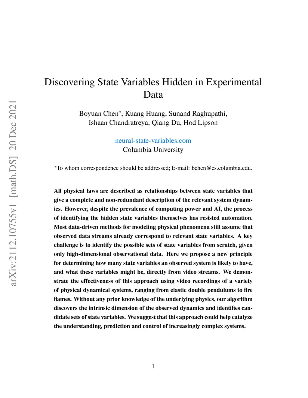 All physical laws are described as relationships between state variables that give a complete and non-redundant description of the relevant system dynamics. However, despite the prevalence of computing power and AI, the process of identifying the hidden state variables themselves has resisted automation. Most data-driven methods for modeling physical phenomena still assume that observed data streams already correspond to relevant state variables. A key challenge is to identify the possible sets of state variables from scratch, given only high-dimensional observational data. Here we propose a new principle for determining how many state variables an observed system is likely to have, and what these variables might be, directly from video streams. We demonstrate the effectiveness of this approach using video recordings of a variety of physical dynamical systems, ranging from elastic double pendulums to fire flames. Without any prior knowledge of the underlying physics, our algorithm discovers the intrinsic dimension of the observed dynamics and identifies candidate sets of state variables. We suggest that this approach could help catalyze the understanding, prediction and control of increasingly complex systems. Project website is at: https://www.cs.columbia.edu/~bchen/neural-state-variables