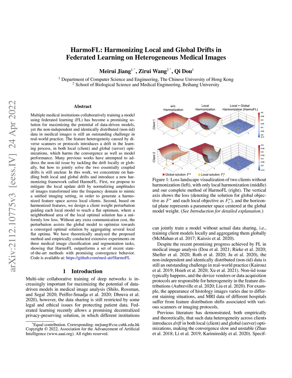 Multiple medical institutions collaboratively training a model using federated learning (FL) has become a promising solution for maximizing the potential of data-driven models, yet the non-independent and identically distributed (non-iid) data in medical images is still an outstanding challenge in real-world practice. The feature heterogeneity caused by diverse scanners or protocols introduces a drift in the learning process, in both local (client) and global (server) optimizations, which harms the convergence as well as model performance. Many previous works have attempted to address the non-iid issue by tackling the drift locally or globally, but how to jointly solve the two essentially coupled drifts is still unclear. In this work, we concentrate on handling both local and global drifts and introduce a new harmonizing framework called HarmoFL. First, we propose to mitigate the local update drift by normalizing amplitudes of images transformed into the frequency domain to mimic a unified imaging setting, in order to generate a harmonized feature space across local clients. Second, based on harmonized features, we design a client weight perturbation guiding each local model to reach a flat optimum, where a neighborhood area of the local optimal solution has a uniformly low loss. Without any extra communication cost, the perturbation assists the global model to optimize towards a converged optimal solution by aggregating several local flat optima. We have theoretically analyzed the proposed method and empirically conducted extensive experiments on three medical image classification and segmentation tasks, showing that HarmoFL outperforms a set of recent state-of-the-art methods with promising convergence behavior. Code is available at https://github.com/med-air/HarmoFL.