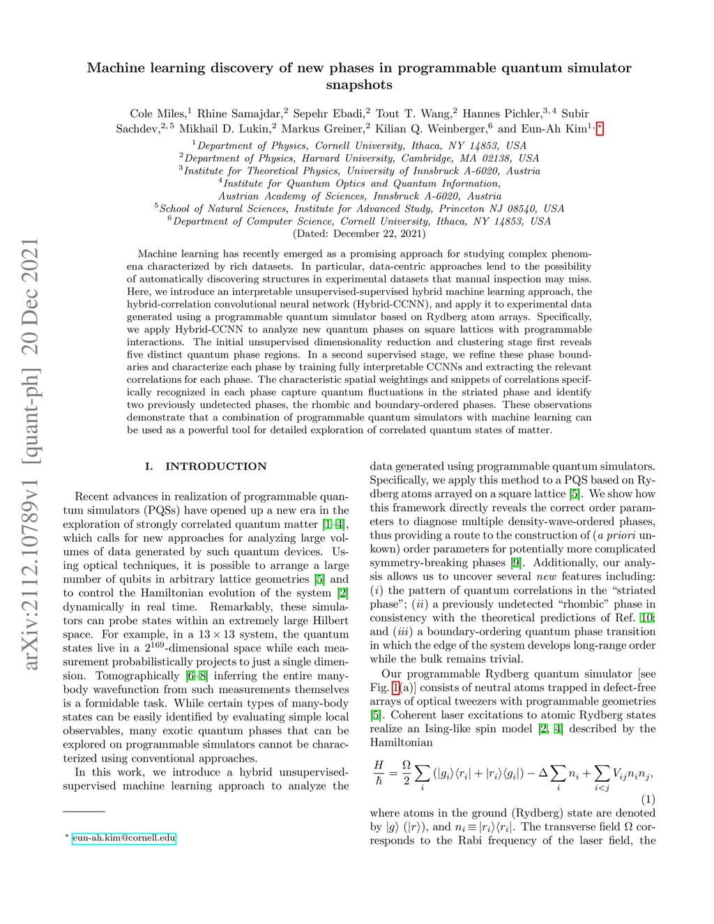 Machine learning has recently emerged as a promising approach for studying complex phenomena characterized by rich datasets. In particular, data-centric approaches lend to the possibility of automatically discovering structures in experimental datasets that manual inspection may miss. Here, we introduce an interpretable unsupervised-supervised hybrid machine learning approach, the hybrid-correlation convolutional neural network (Hybrid-CCNN), and apply it to experimental data generated using a programmable quantum simulator based on Rydberg atom arrays. Specifically, we apply Hybrid-CCNN to analyze new quantum phases on square lattices with programmable interactions. The initial unsupervised dimensionality reduction and clustering stage first reveals five distinct quantum phase regions. In a second supervised stage, we refine these phase boundaries and characterize each phase by training fully interpretable CCNNs and extracting the relevant correlations for each phase. The characteristic spatial weightings and snippets of correlations specifically recognized in each phase capture quantum fluctuations in the striated phase and identify two previously undetected phases, the rhombic and boundary-ordered phases. These observations demonstrate that a combination of programmable quantum simulators with machine learning can be used as a powerful tool for detailed exploration of correlated quantum states of matter.