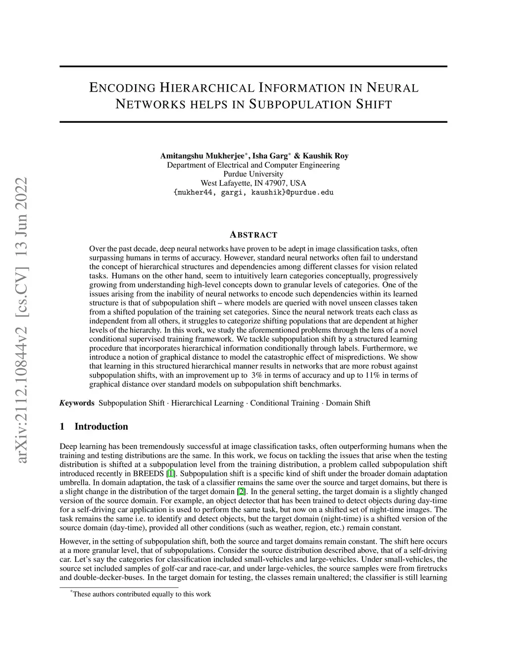 Over the past decade, deep neural networks have proven to be adept in image classification tasks, often surpassing humans in terms of accuracy. However, standard neural networks often fail to understand the concept of hierarchical structures and dependencies among different classes for vision related tasks. Humans on the other hand, seem to learn categories conceptually, progressively growing from understanding high-level concepts down to granular levels of categories. One of the issues arising from the inability of neural networks to encode such dependencies within its learned structure is that of subpopulation shift -- where models are queried with novel unseen classes taken from a shifted population of the training set categories. Since the neural network treats each class as independent from all others, it struggles to categorize shifting populations that are dependent at higher levels of the hierarchy. In this work, we study the aforementioned problems through the lens of a novel conditional supervised training framework. We tackle subpopulation shift by a structured learning procedure that incorporates hierarchical information conditionally through labels. Furthermore, we introduce a notion of graphical distance to model the catastrophic effect of mispredictions. We show that learning in this structured hierarchical manner results in networks that are more robust against subpopulation shifts, with an improvement of around ~2% in terms of accuracy and around 8.5\% in terms of graphical distance over standard models on subpopulation shift benchmarks.