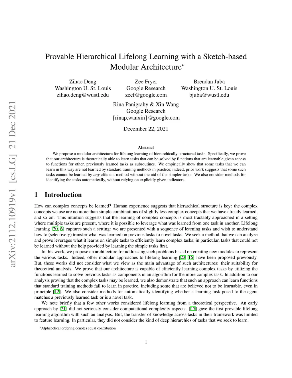We propose a modular architecture for the lifelong learning of hierarchically structured tasks. Specifically, we prove that our architecture is theoretically able to learn tasks that can be solved by functions that are learnable given access to functions for other, previously learned tasks as subroutines. We empirically show that some tasks that we can learn in this way are not learned by standard training methods in practice; indeed, prior work suggests that some such tasks cannot be learned by any efficient method without the aid of the simpler tasks. We also consider methods for identifying the tasks automatically, without relying on explicitly given indicators.