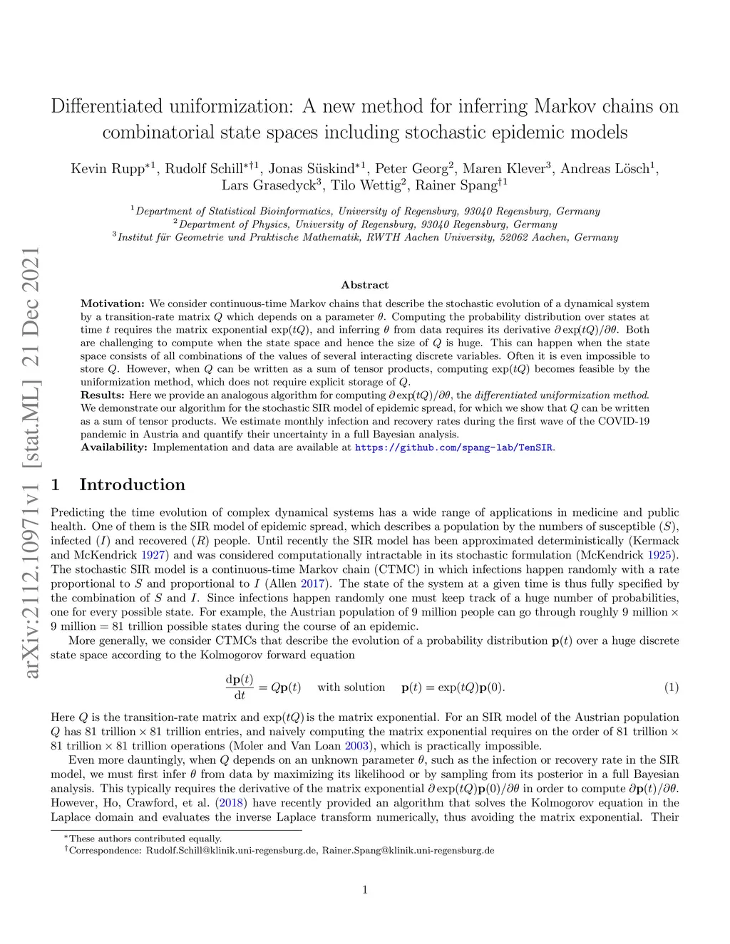 Motivation: We consider continuous-time Markov chains that describe the stochastic evolution of a dynamical system by a transition-rate matrix which depends on a parameter . Computing the probability distribution over states at time requires the matrix exponential , and inferring from data requires its derivative . Both are challenging to compute when the state space and hence the size of is huge. This can happen when the state space consists of all combinations of the values of several interacting discrete variables. Often it is even impossible to store . However, when can be written as a sum of tensor products, computing becomes feasible by the uniformization method, which does not require explicit storage of . Results: Here we provide an analogous algorithm for computing , the differentiated uniformization method. We demonstrate our algorithm for the stochastic SIR model of epidemic spread, for which we show that can be written as a sum of tensor products. We estimate monthly infection and recovery rates during the first wave of the COVID-19 pandemic in Austria and quantify their uncertainty in a full Bayesian analysis. Availability: Implementation and data are available at https://github.com/spang-lab/TenSIR.