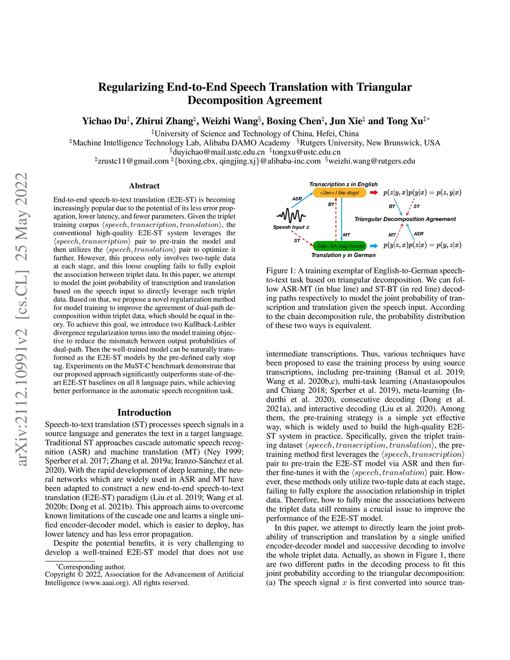 End-to-end speech-to-text translation (E2E-ST) is becoming increasingly popular due to the potential of its less error propagation, lower latency, and fewer parameters. Given the triplet training corpus , the conventional high-quality E2E-ST system leverages the pair to pre-train the model and then utilizes the pair to optimize it further. However, this process only involves two-tuple data at each stage, and this loose coupling fails to fully exploit the association between triplet data. In this paper, we attempt to model the joint probability of transcription and translation based on the speech input to directly leverage such triplet data. Based on that, we propose a novel regularization method for model training to improve the agreement of dual-path decomposition within triplet data, which should be equal in theory. To achieve this goal, we introduce two Kullback-Leibler divergence regularization terms into the model training objective to reduce the mismatch between output probabilities of dual-path. Then the well-trained model can be naturally transformed as the E2E-ST models by the pre-defined early stop tag. Experiments on the MuST-C benchmark demonstrate that our proposed approach significantly outperforms state-of-the-art E2E-ST baselines on all 8 language pairs, while achieving better performance in the automatic speech recognition task. Our code is open-sourced at https://github.com/duyichao/E2E-ST-TDA.