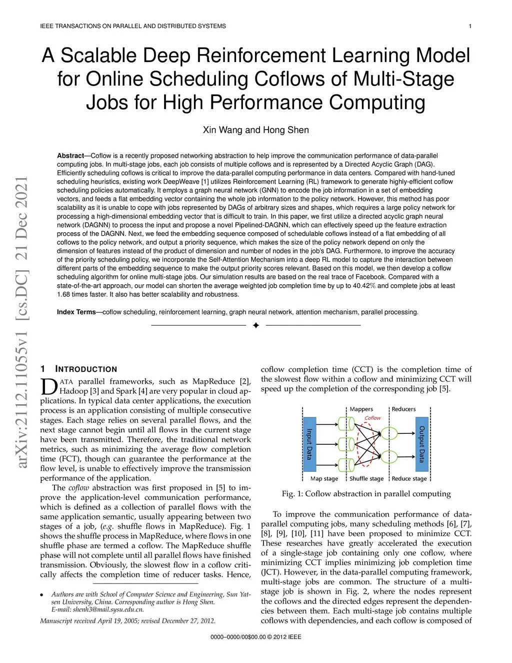 Coflow is a recently proposed networking abstraction to help improve the communication performance of data-parallel computing jobs. In multi-stage jobs, each job consists of multiple coflows and is represented by a Directed Acyclic Graph (DAG). Efficiently scheduling coflows is critical to improve the data-parallel computing performance in data centers. Compared with hand-tuned scheduling heuristics, existing work DeepWeave [1] utilizes Reinforcement Learning (RL) framework to generate highly-efficient coflow scheduling policies automatically. It employs a graph neural network (GNN) to encode the job information in a set of embedding vectors, and feeds a flat embedding vector containing the whole job information to the policy network. However, this method has poor scalability as it is unable to cope with jobs represented by DAGs of arbitrary sizes and shapes, which requires a large policy network for processing a high-dimensional embedding vector that is difficult to train. In this paper, we first utilize a directed acyclic graph neural network (DAGNN) to process the input and propose a novel Pipelined-DAGNN, which can effectively speed up the feature extraction process of the DAGNN. Next, we feed the embedding sequence composed of schedulable coflows instead of a flat embedding of all coflows to the policy network, and output a priority sequence, which makes the size of the policy network depend on only the dimension of features instead of the product of dimension and number of nodes in the job's DAG.Furthermore, to improve the accuracy of the priority scheduling policy, we incorporate the Self-Attention Mechanism into a deep RL model to capture the interaction between different parts of the embedding sequence to make the output priority scores relevant. Based on this model, we then develop a coflow scheduling algorithm for online multi-stage jobs.