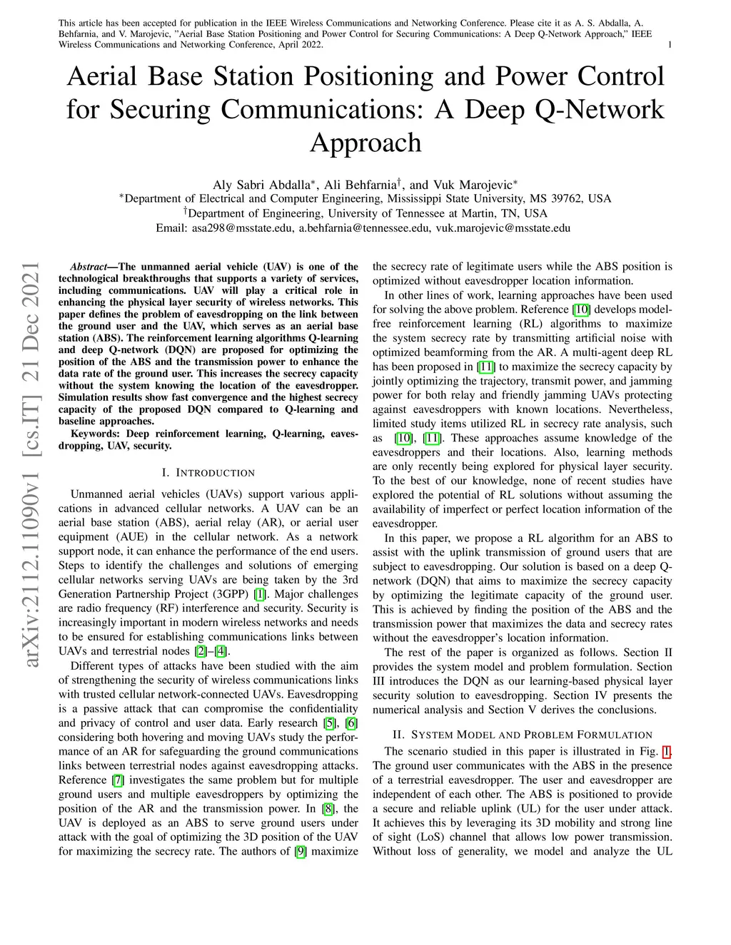 The unmanned aerial vehicle (UAV) is one of the technological breakthroughs that supports a variety of services, including communications. UAV will play a critical role in enhancing the physical layer security of wireless networks. This paper defines the problem of eavesdropping on the link between the ground user and the UAV, which serves as an aerial base station (ABS). The reinforcement learning algorithms Q-learning and deep Q-network (DQN) are proposed for optimizing the position of the ABS and the transmission power to enhance the data rate of the ground user. This increases the secrecy capacity without the system knowing the location of the eavesdropper. Simulation results show fast convergence and the highest secrecy capacity of the proposed DQN compared to Q-learning and baseline approaches.