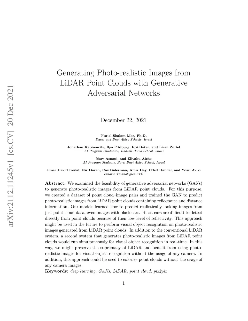 We examined the feasibility of generative adversarial networks (GANs) to generate photo-realistic images from LiDAR point clouds. For this purpose, we created a dataset of point cloud image pairs and trained the GAN to predict photorealistic images from LiDAR point clouds containing reflectance and distance information. Our models learned how to predict realistically looking images from just point cloud data, even images with black cars. Black cars are difficult to detect directly from point clouds because of their low level of reflectivity. This approach might be used in the future to perform visual object recognition on photorealistic images generated from LiDAR point clouds. In addition to the conventional LiDAR system, a second system that generates photorealistic images from LiDAR point clouds would run simultaneously for visual object recognition in real-time. In this way, we might preserve the supremacy of LiDAR and benefit from using photo-realistic images for visual object recognition without the usage of any camera. In addition, this approach could be used to colorize point clouds without the usage of any camera images.