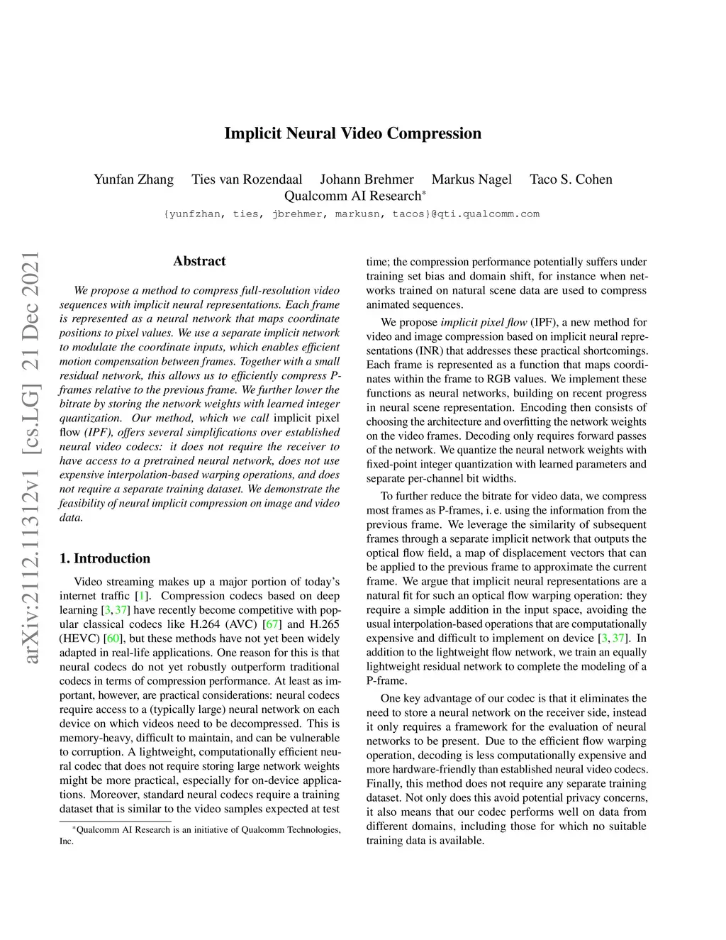 We propose a method to compress full-resolution video sequences with implicit neural representations. Each frame is represented as a neural network that maps coordinate positions to pixel values. We use a separate implicit network to modulate the coordinate inputs, which enables efficient motion compensation between frames. Together with a small residual network, this allows us to efficiently compress P-frames relative to the previous frame. We further lower the bitrate by storing the network weights with learned integer quantization. Our method, which we call implicit pixel flow (IPF), offers several simplifications over established neural video codecs: it does not require the receiver to have access to a pretrained neural network, does not use expensive interpolation-based warping operations, and does not require a separate training dataset. We demonstrate the feasibility of neural implicit compression on image and video data.